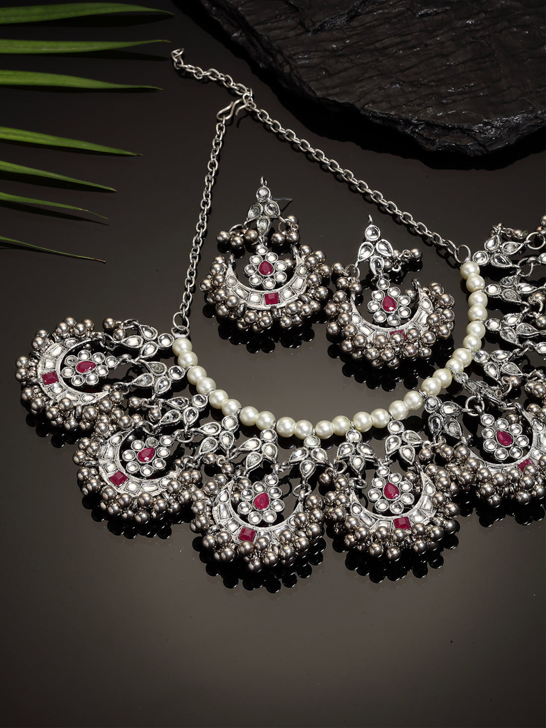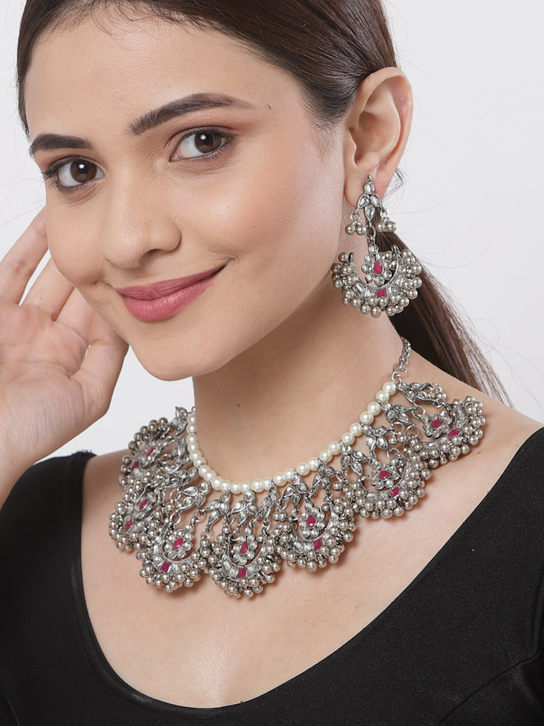 Oxidised Silver-Plated Red Kundan Studded Jewellery Set