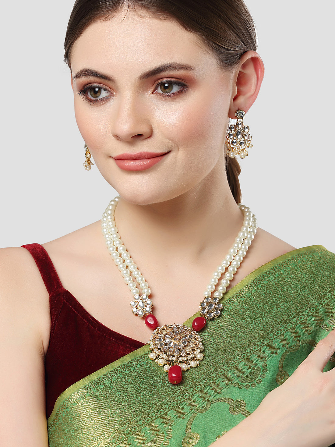 Karatcart Gold Plated Red Beads and Pearl Studded Kundan Necklace Set for Women