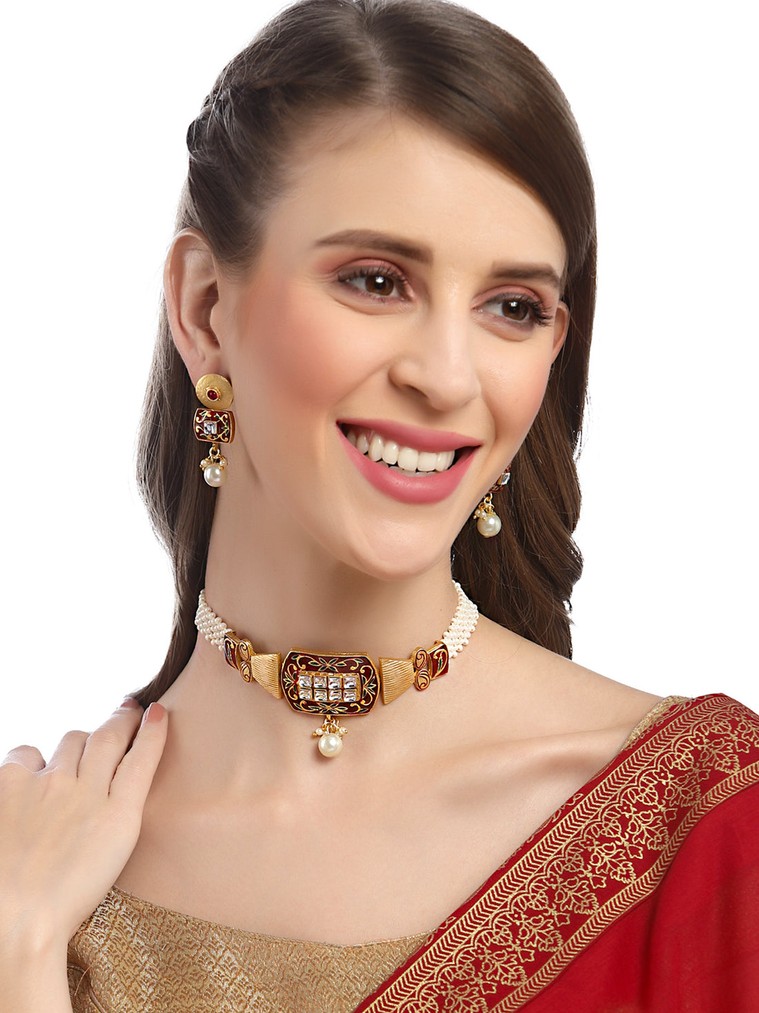 Karatcart Red Crystal and Pearl Beaded Kundan Choker Necklace Set for Women