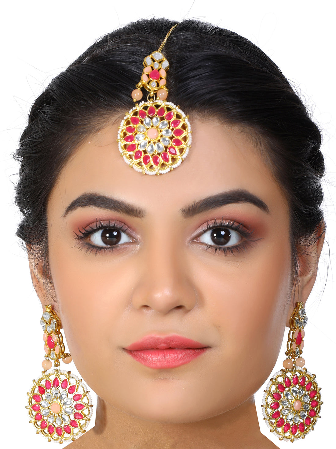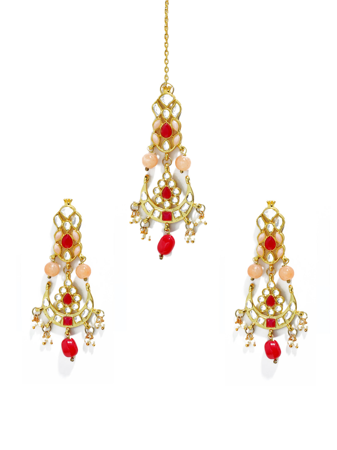 Gold Plated Peach and Red Beads Kundan Dangler Earrings with Maangtikka for Women. It's Five...