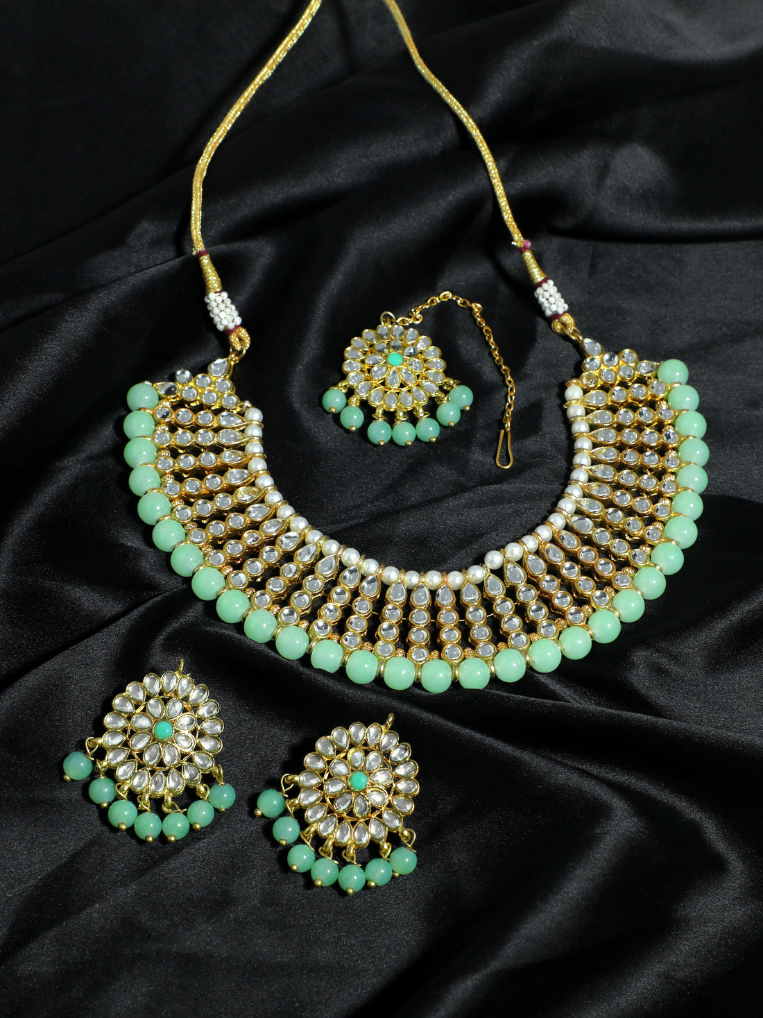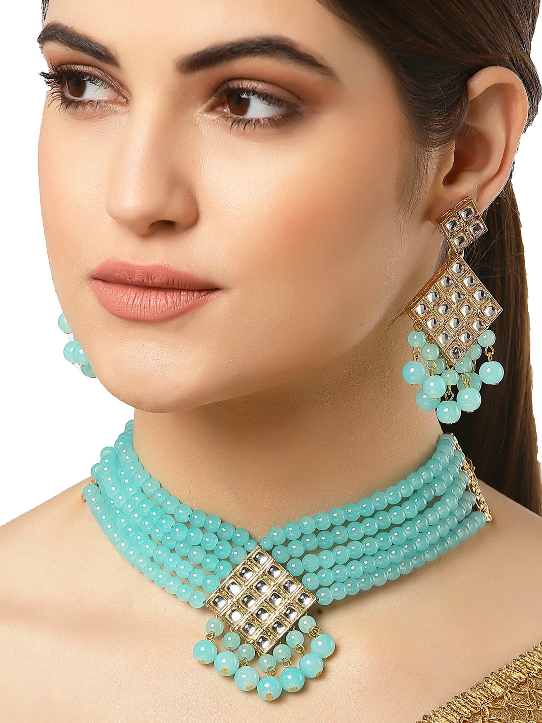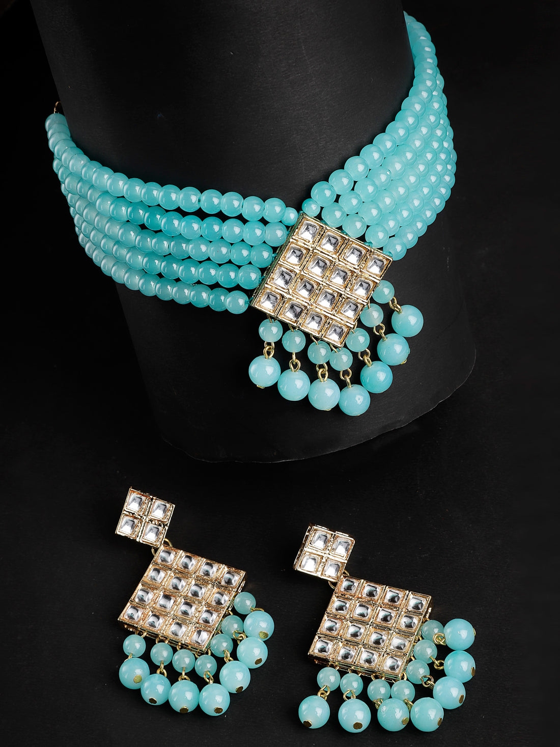 Handcrafted Blue Beads Gold Plated Kundan Choker Necklace Set