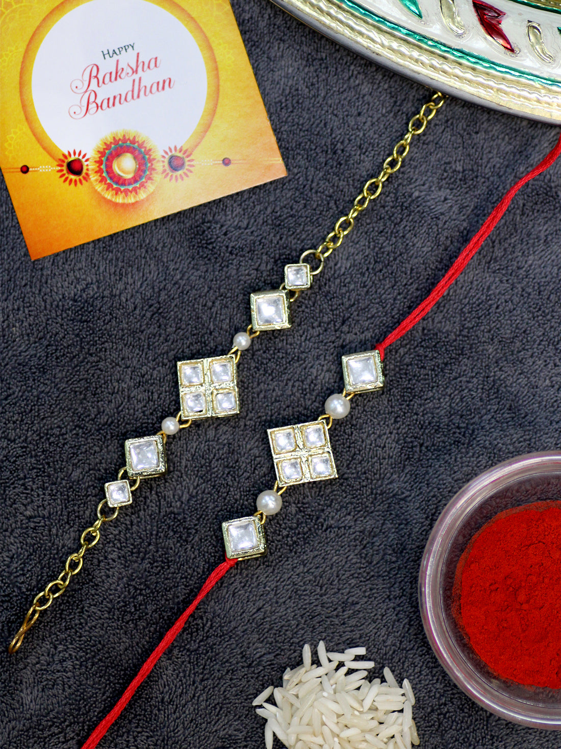 Karatcart Rakhi for Brother and Bhabhi Set of 2 Gold Plated Square Polki Kundan Bhiya Bhabhi Rakhi Combo with Roli & Chawal