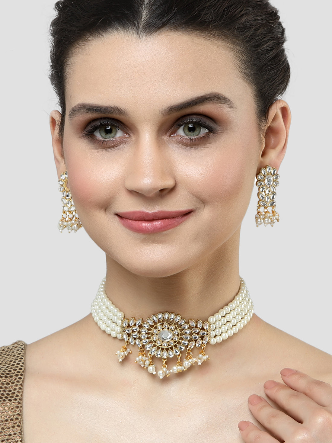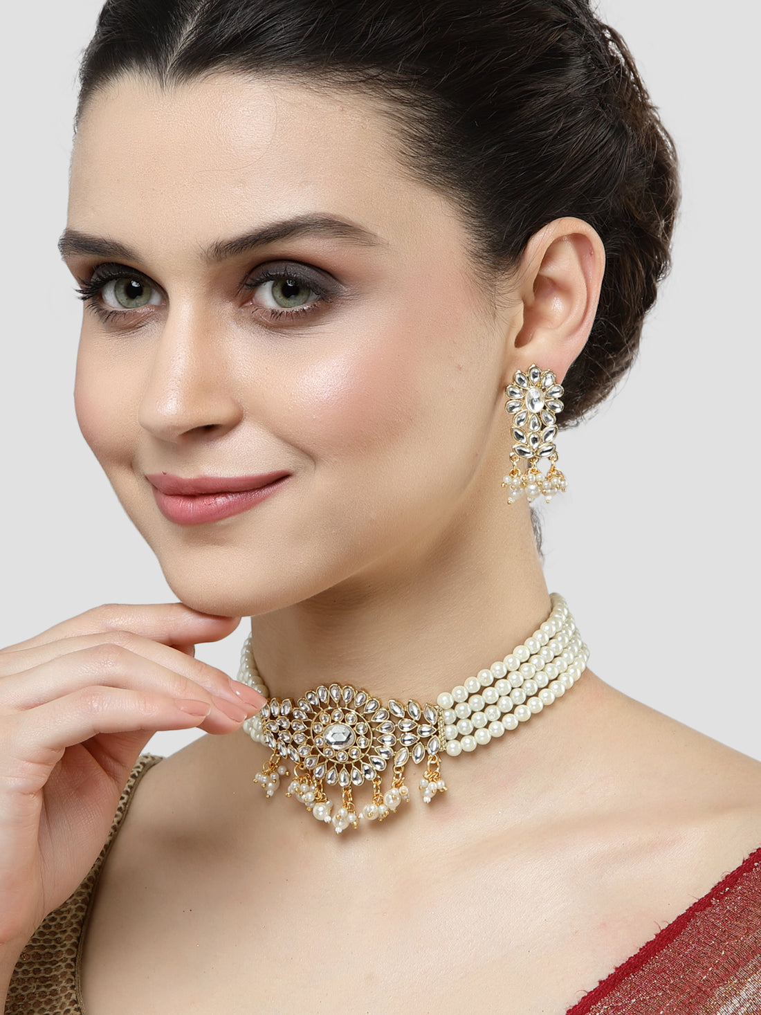 Karatcart Gold Plated Pearl Beaded Kundan Choker Necklace Set