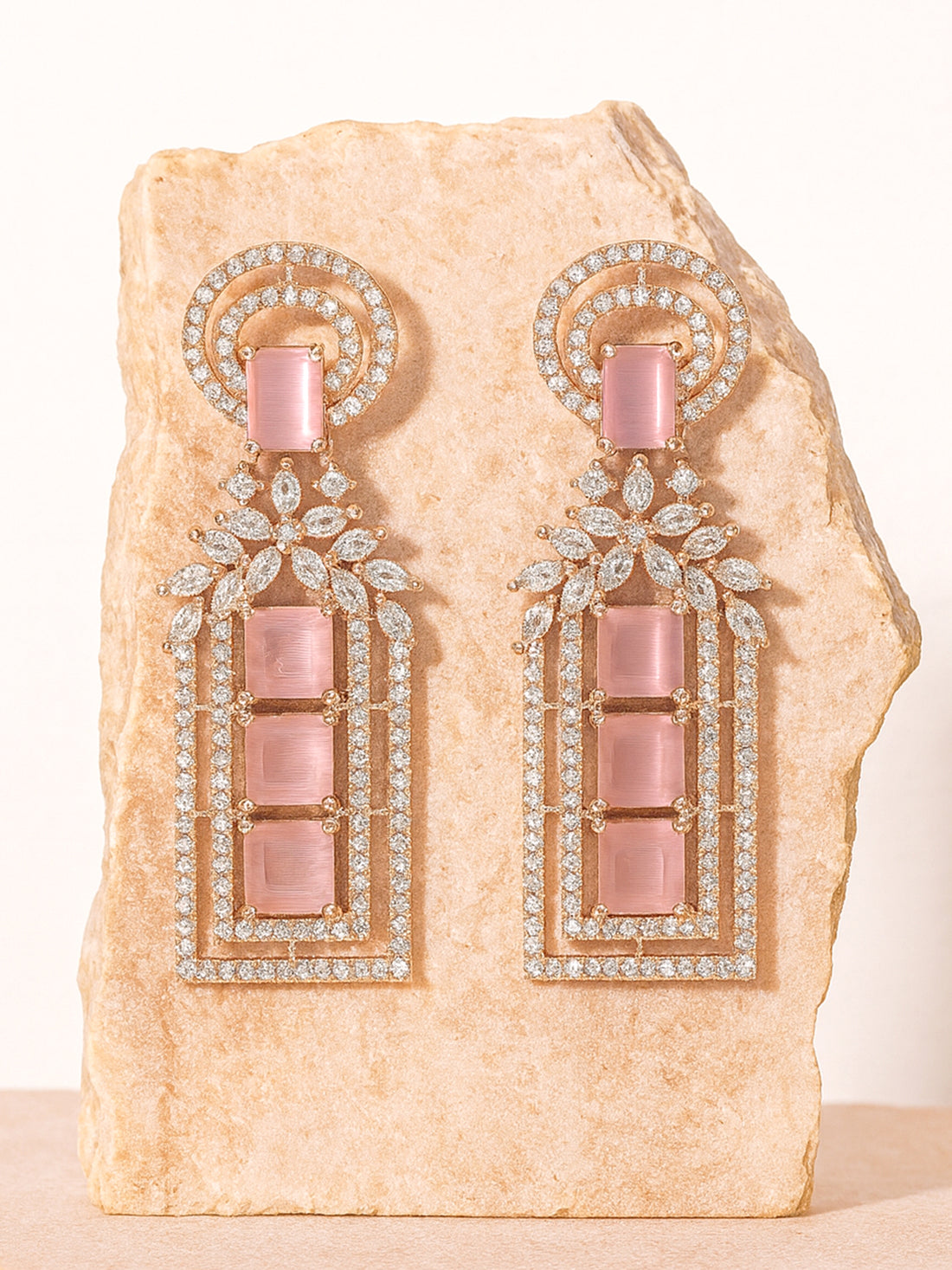Pink Rose Gold Plated American Diamond Studded Drop Earrings