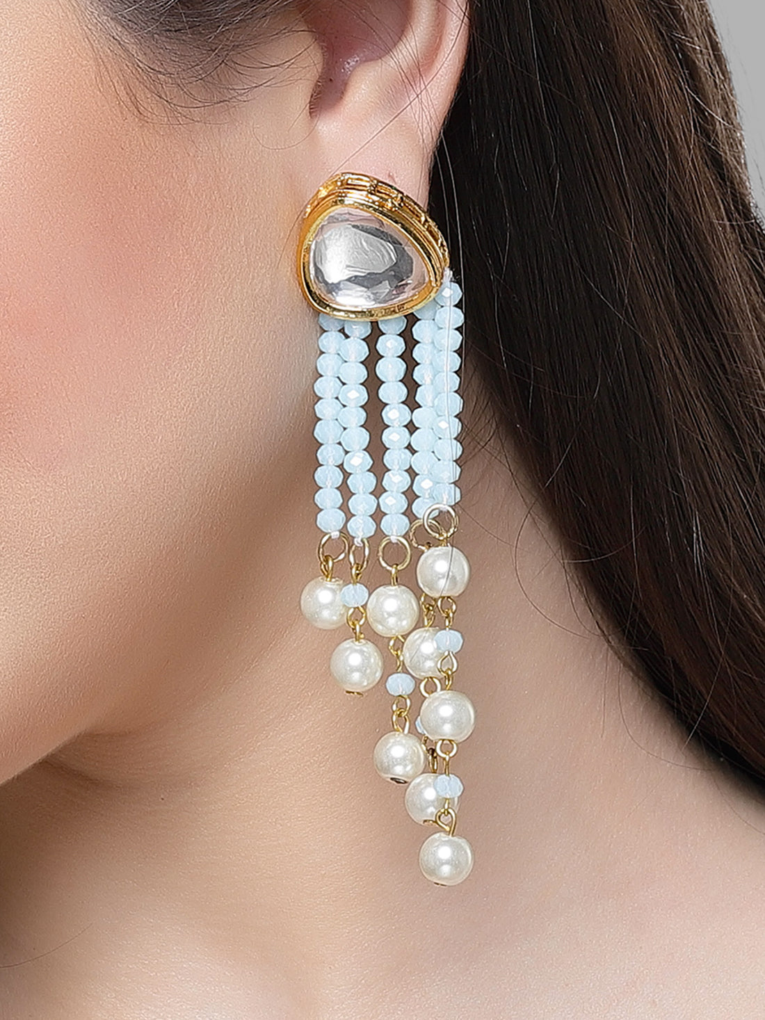 Karatcart Gold Plated Light Blue Bead Kundan Drop Earrings for Women