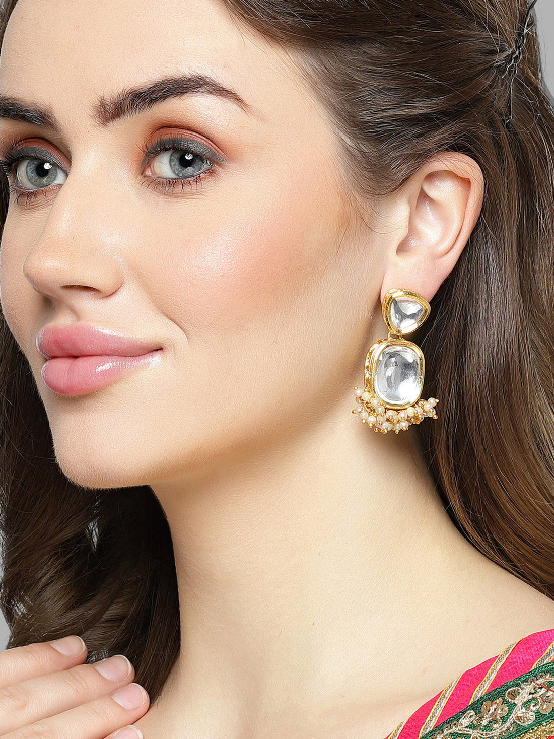 Karatcart Gold Plated Pink and Light Green Kundan Drop Earrings for Women