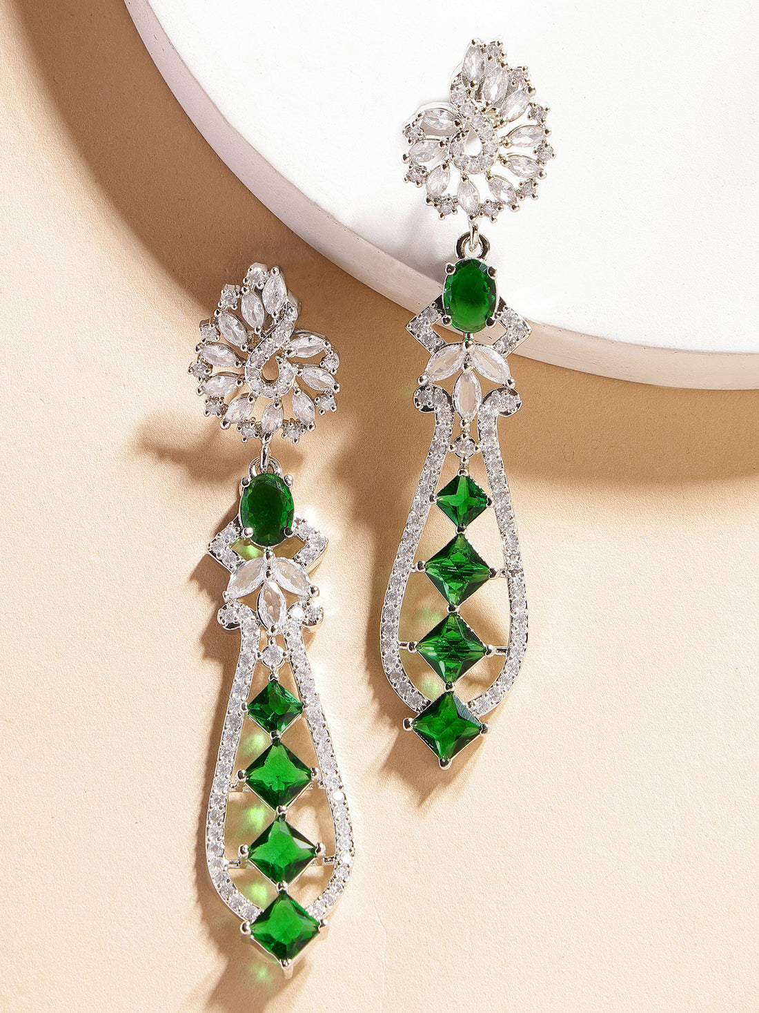Karatcart Designer Silver Plated Green American Diamond Dangler Earrings for Women