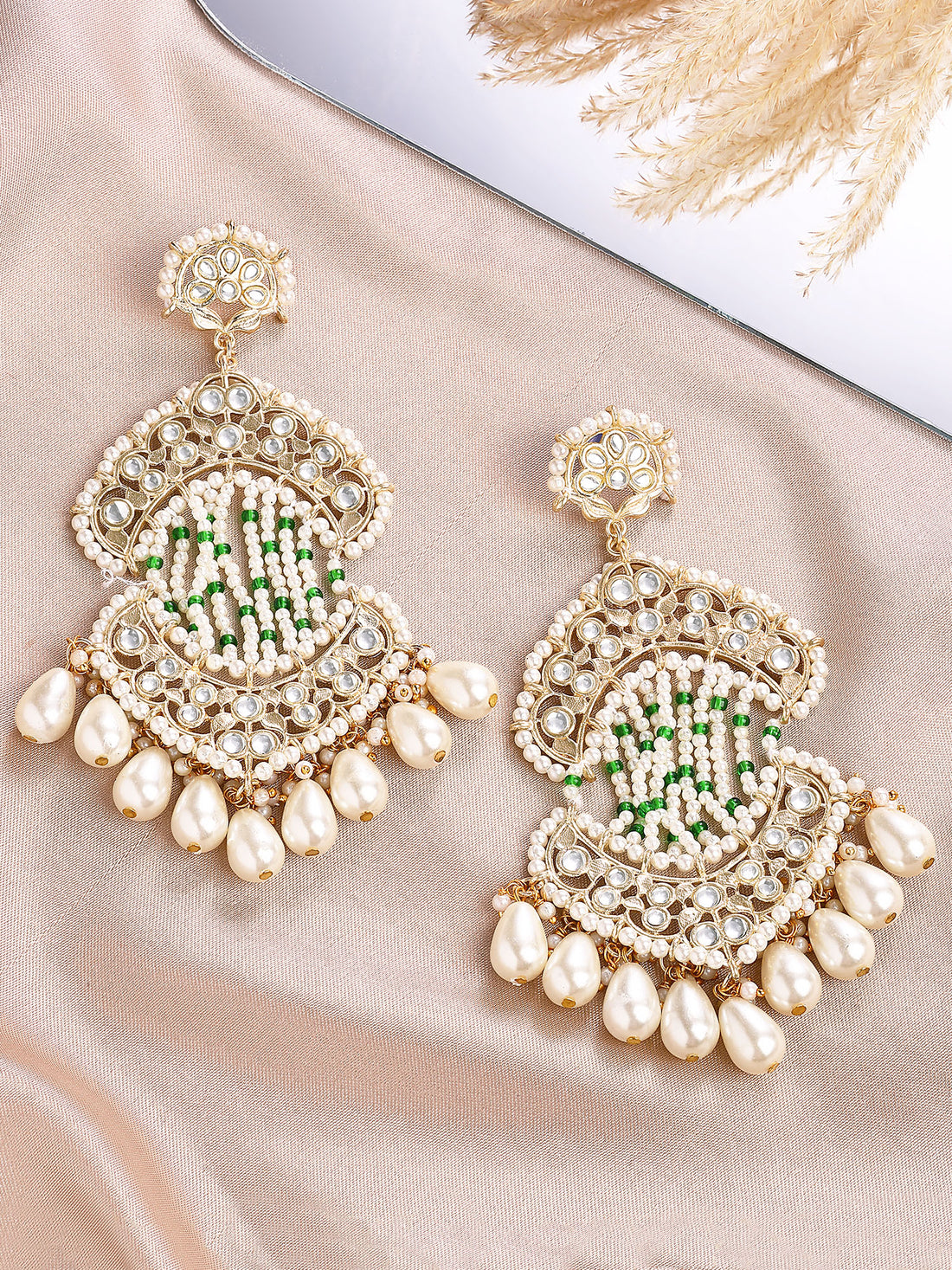 KARATCART Gold-Plated Pearl Dangler Earrings with Green Beads and Crystal Embellishments
