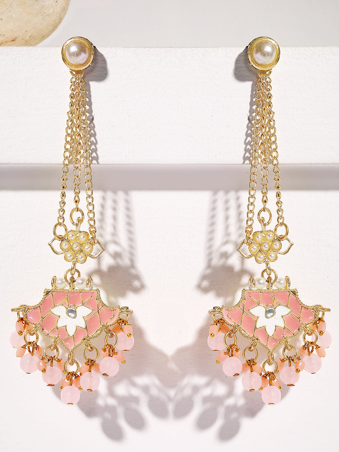 KARATCART Designer Gold-Plated Pink Meena and Floral Kundan Drop Earrings for Women