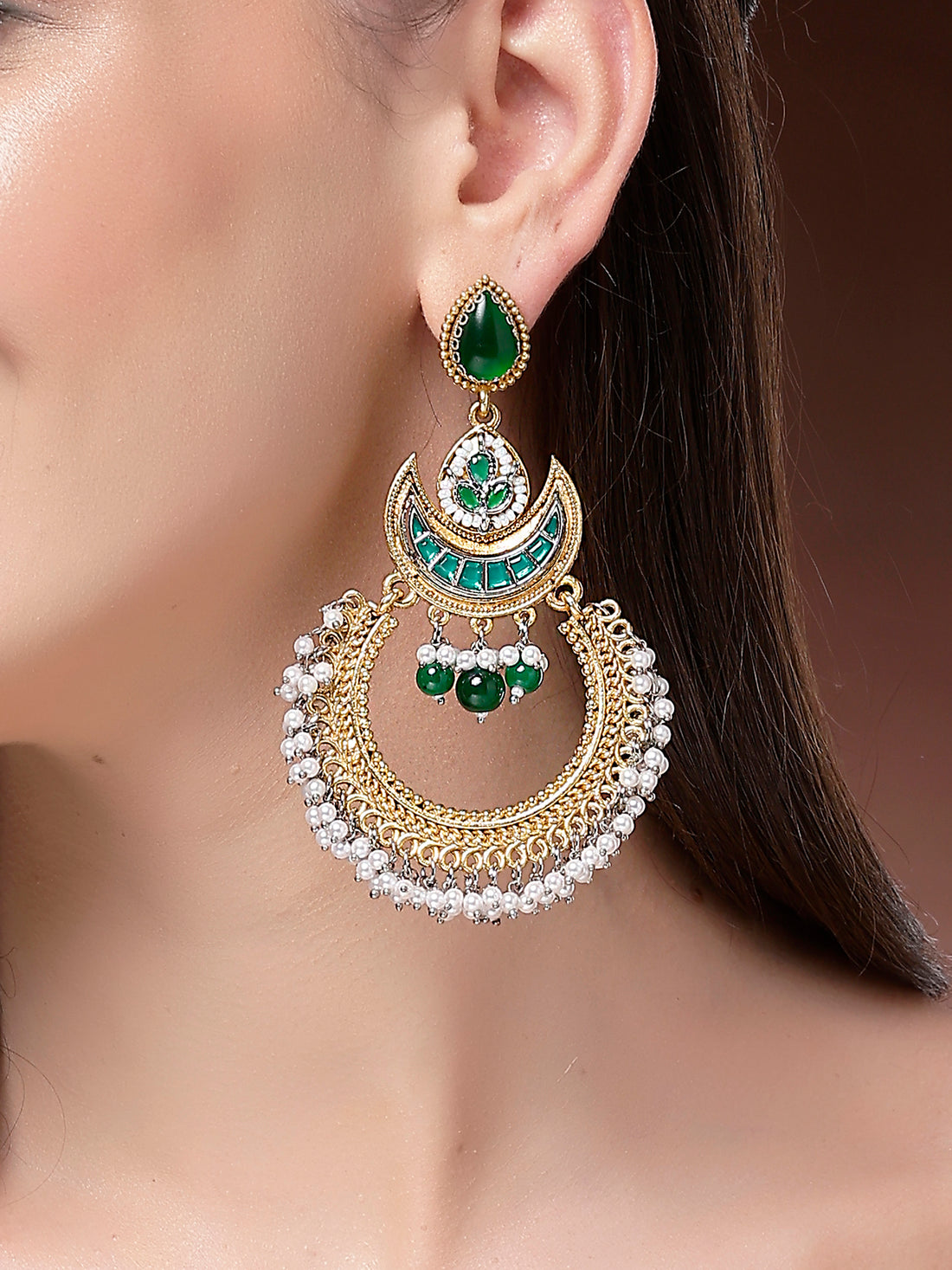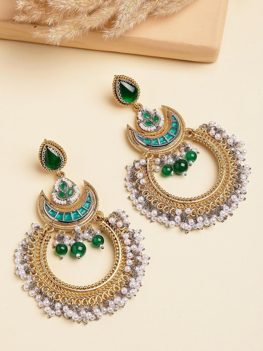 Karatcart Traditional Gold-Toned Chandbali Earrings with Green Stones and Pearl Tassels
