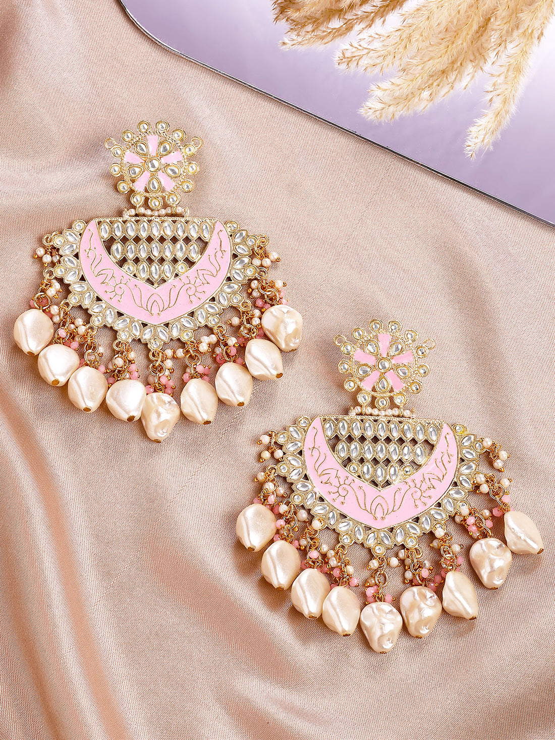 KARATCART Designer Gold-Plated Pink Meena and Pearl Studded Kundan Chandbali Earrings for Women