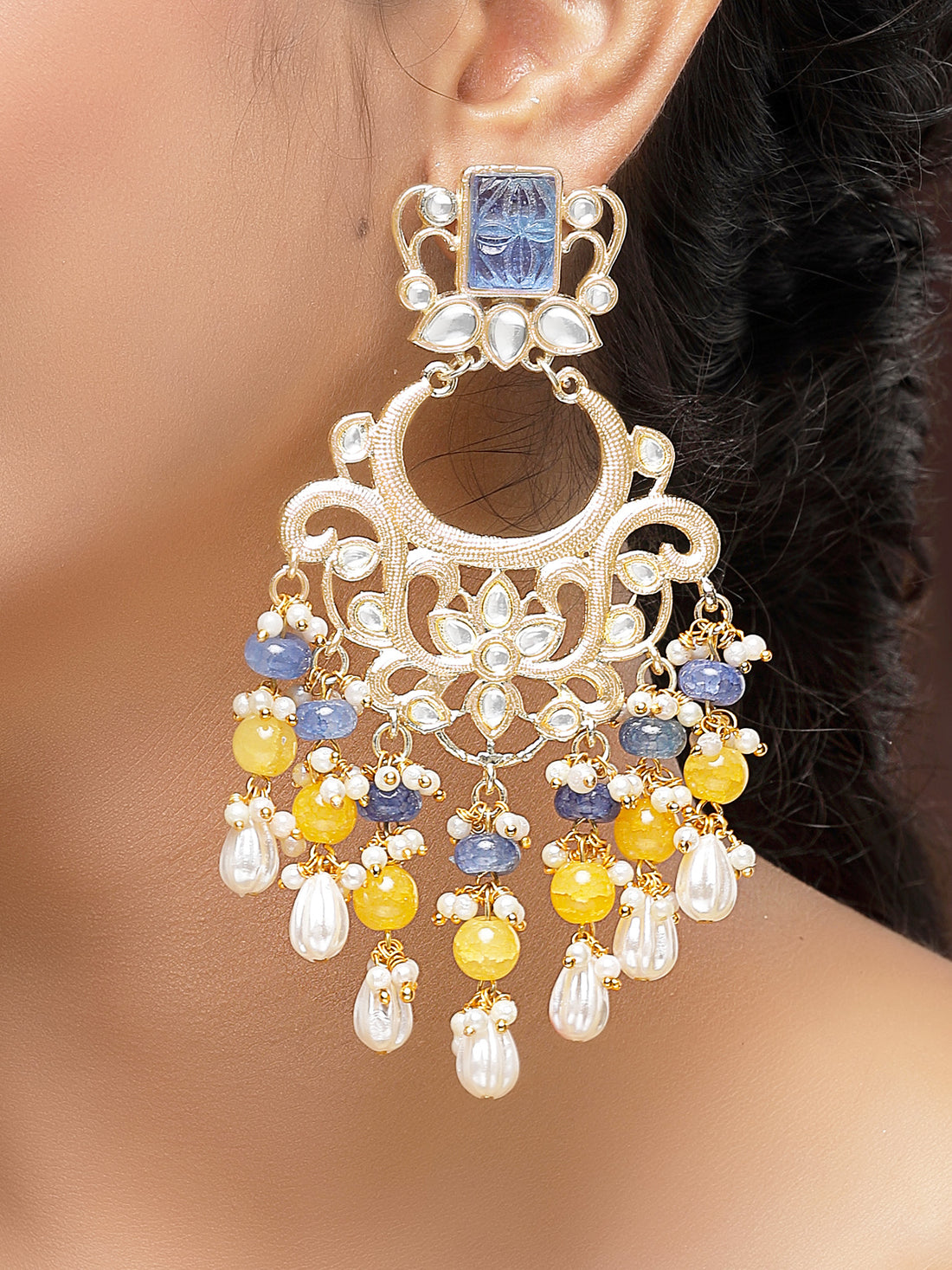 KARATCART Designer Gold-Plated Blue and Yellow Bead Kundan Dangler Earrings for Women