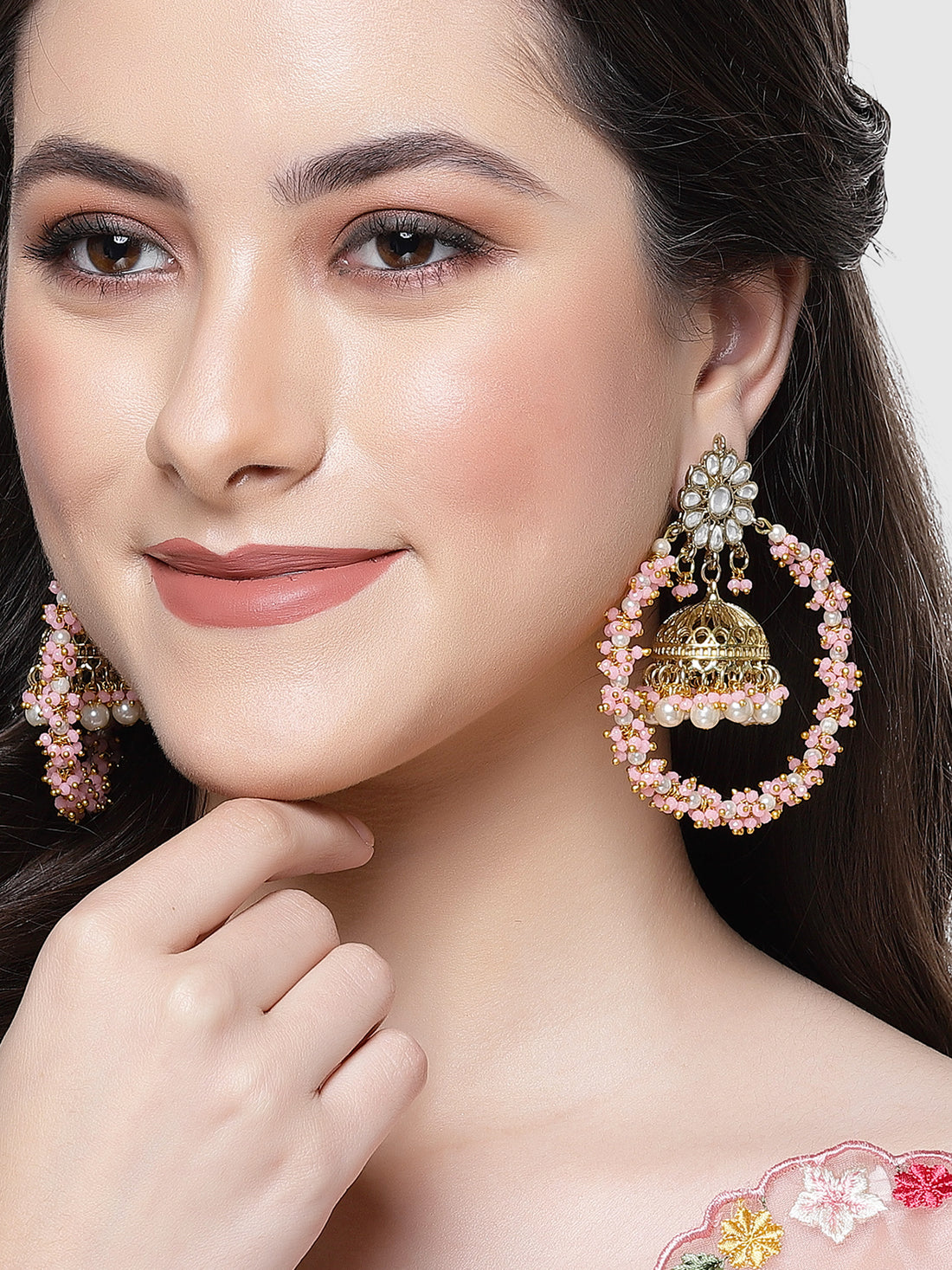 Karatcart Gold Plated Pink Crystal and Pearl Jhumki Hoop Earrings for Women