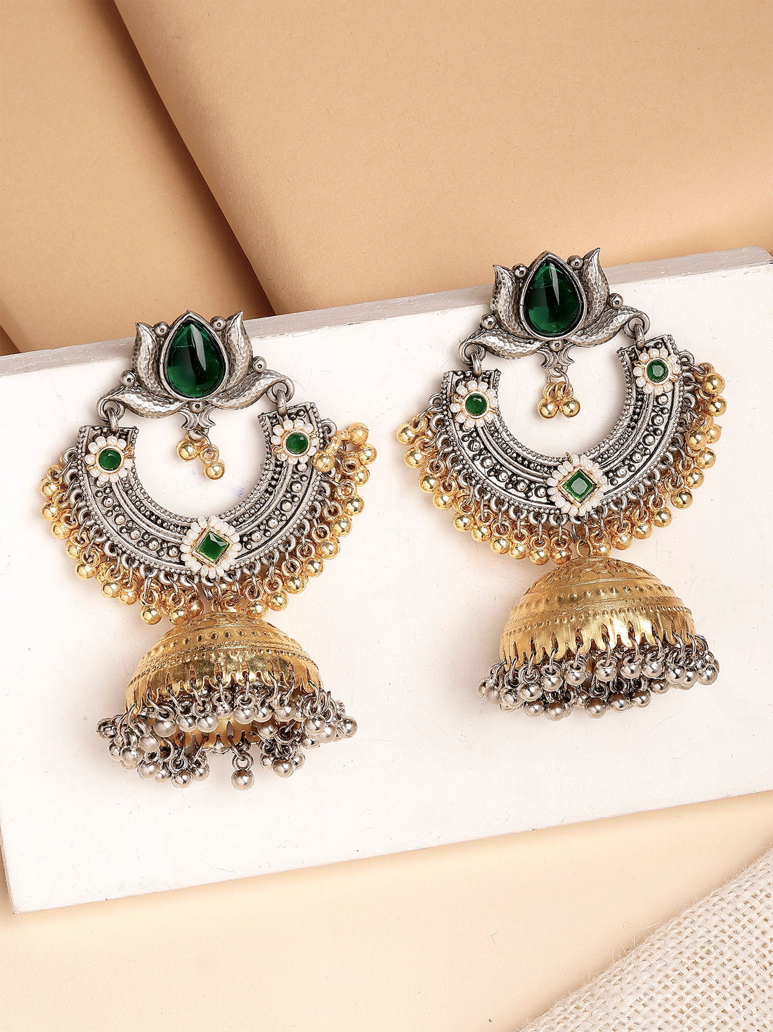 Karatcart Designer Oxidized Silver and Gold Plated Green Floral Motif Dual-Tone Jhumka Earrings
