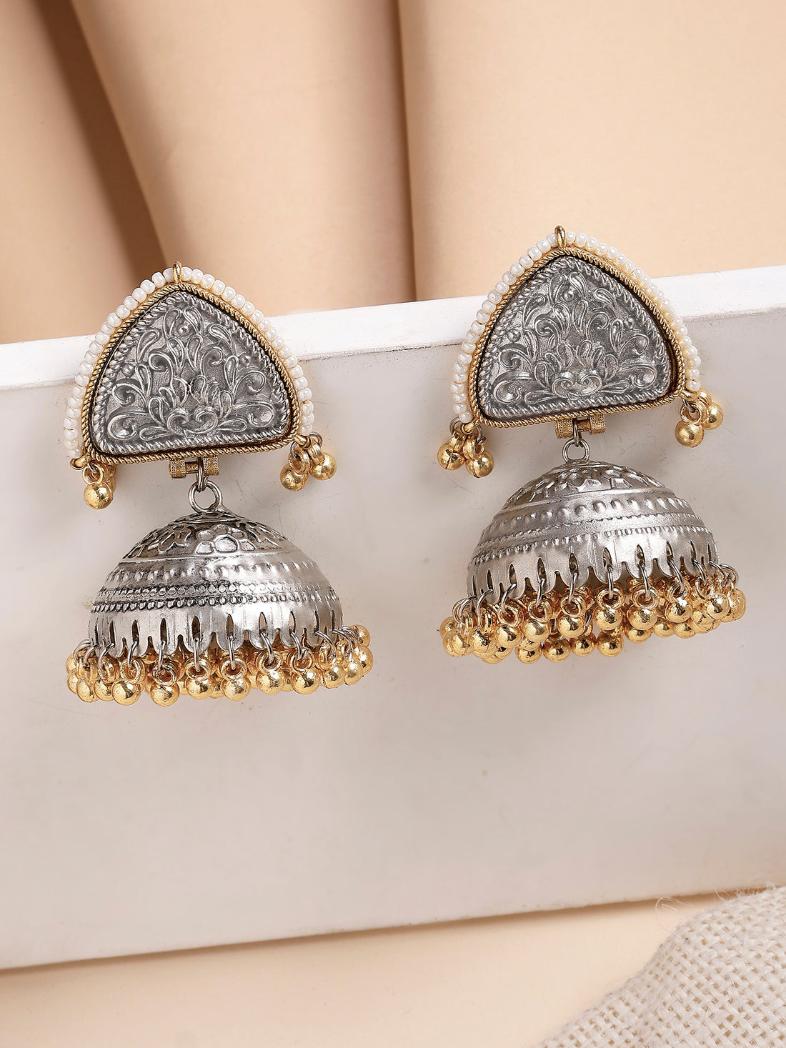 Karatcart Elegant Oxidized Silver-Plated Engraved Triangle Top Jhumka Earrings with Golden Beads