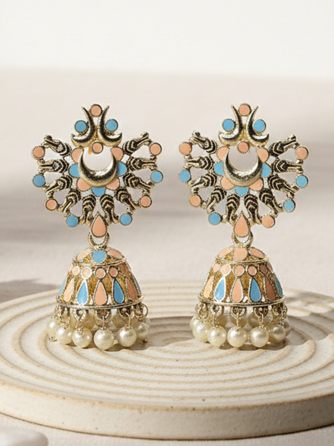 Karatcart Gold Plated Peach and Light Blue Meena Jhumki Earrings for Women