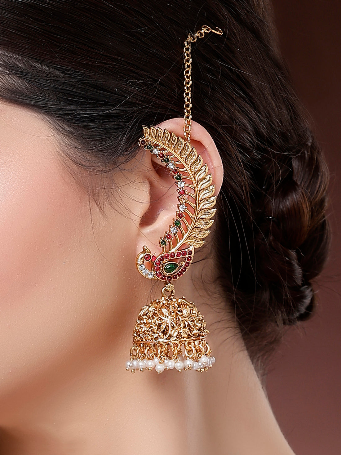Karatcart Red and Green Gold Plated Peacock Design Kaanchain Jhumki Earrings for Women