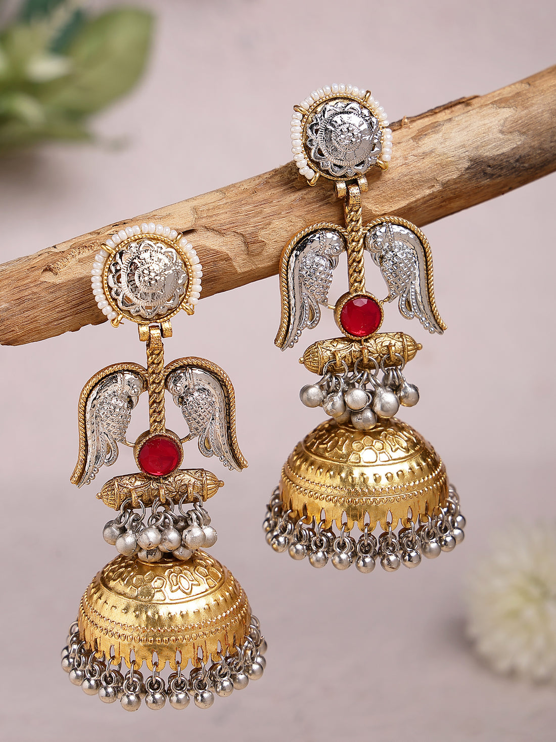 Karatcart Ethnic Gold-Plated Dual-Tone Jhumka Earrings with Silver Bird Motifs & Red Stone