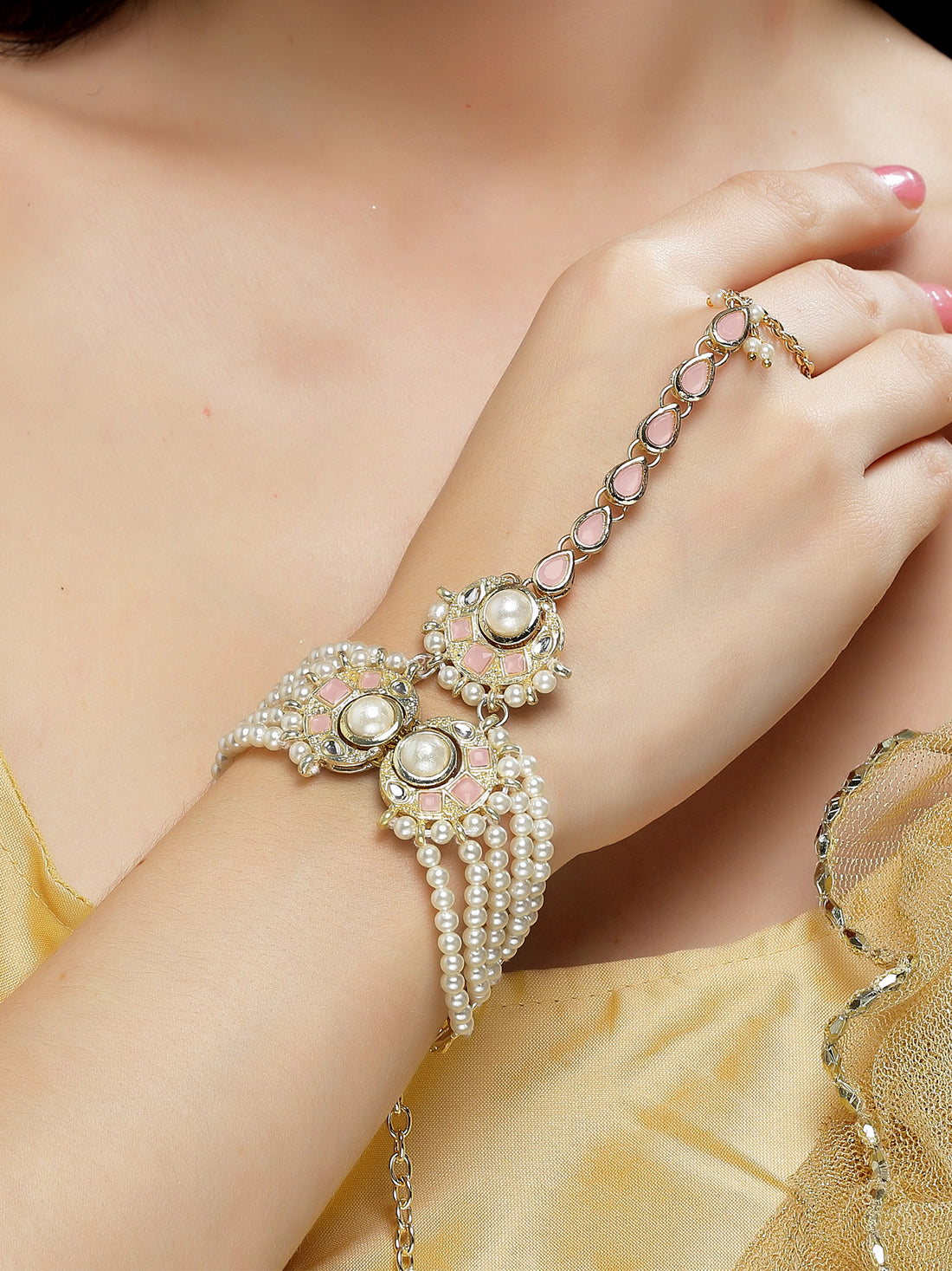 Karatcart Gold Plated Pink Kundan and Pearl Hathphool for Women