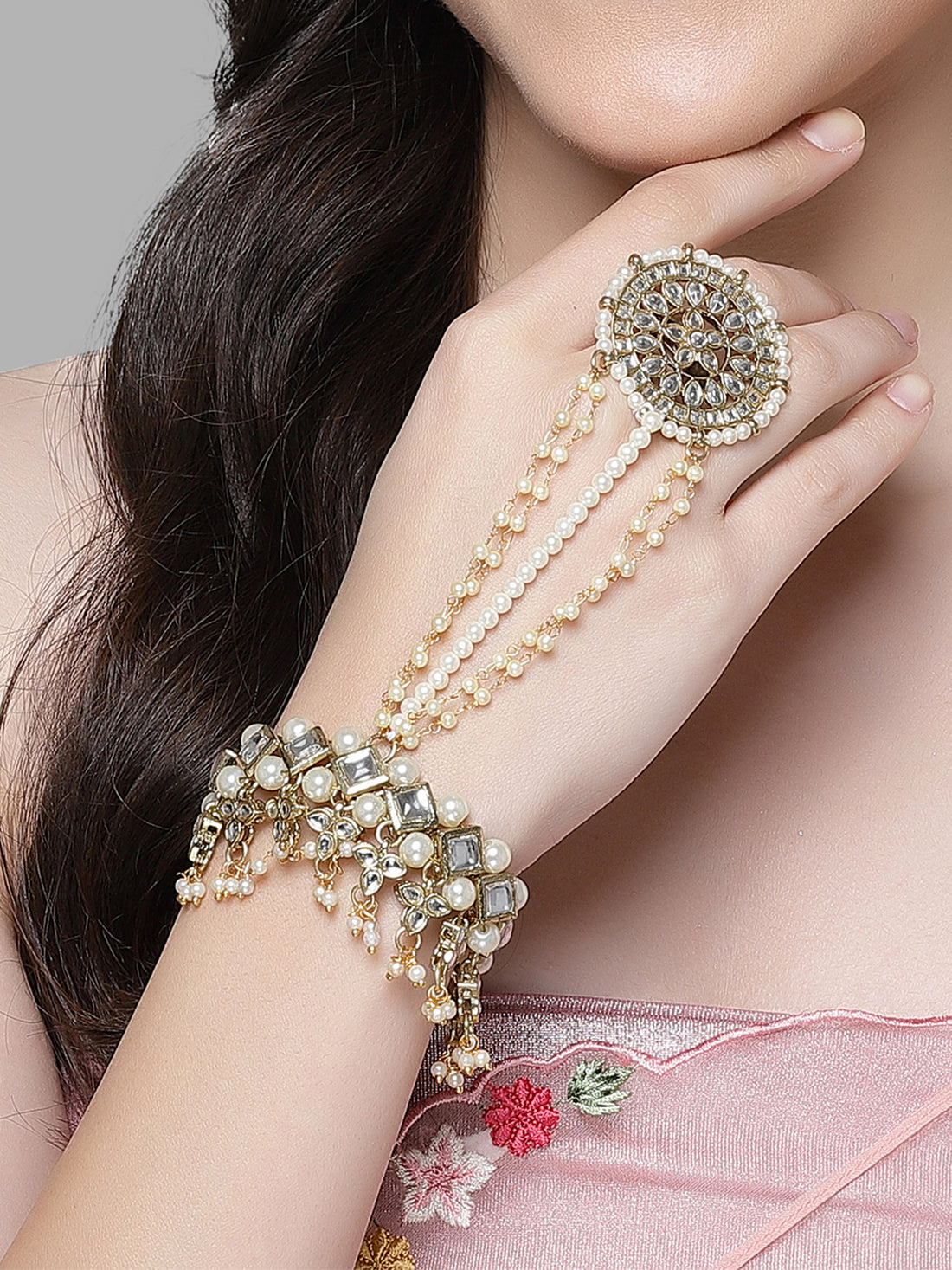 Karatcart Gold Plated Floral Design Pearl and Kundan Ring Hathphool for Women