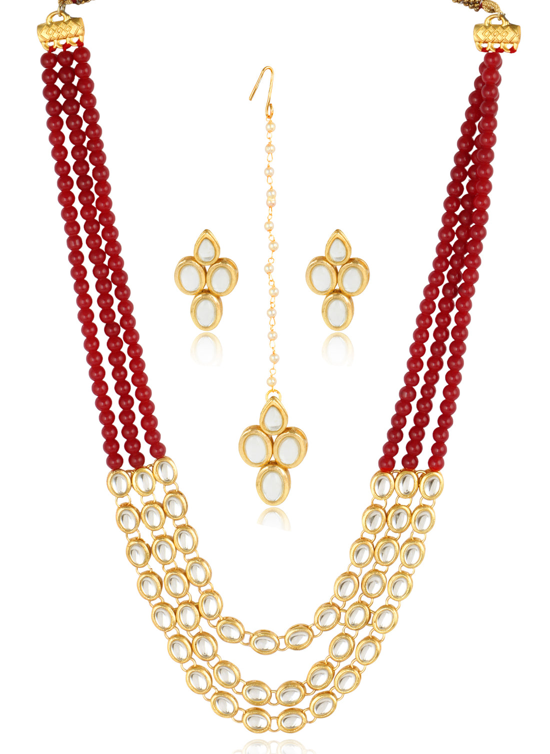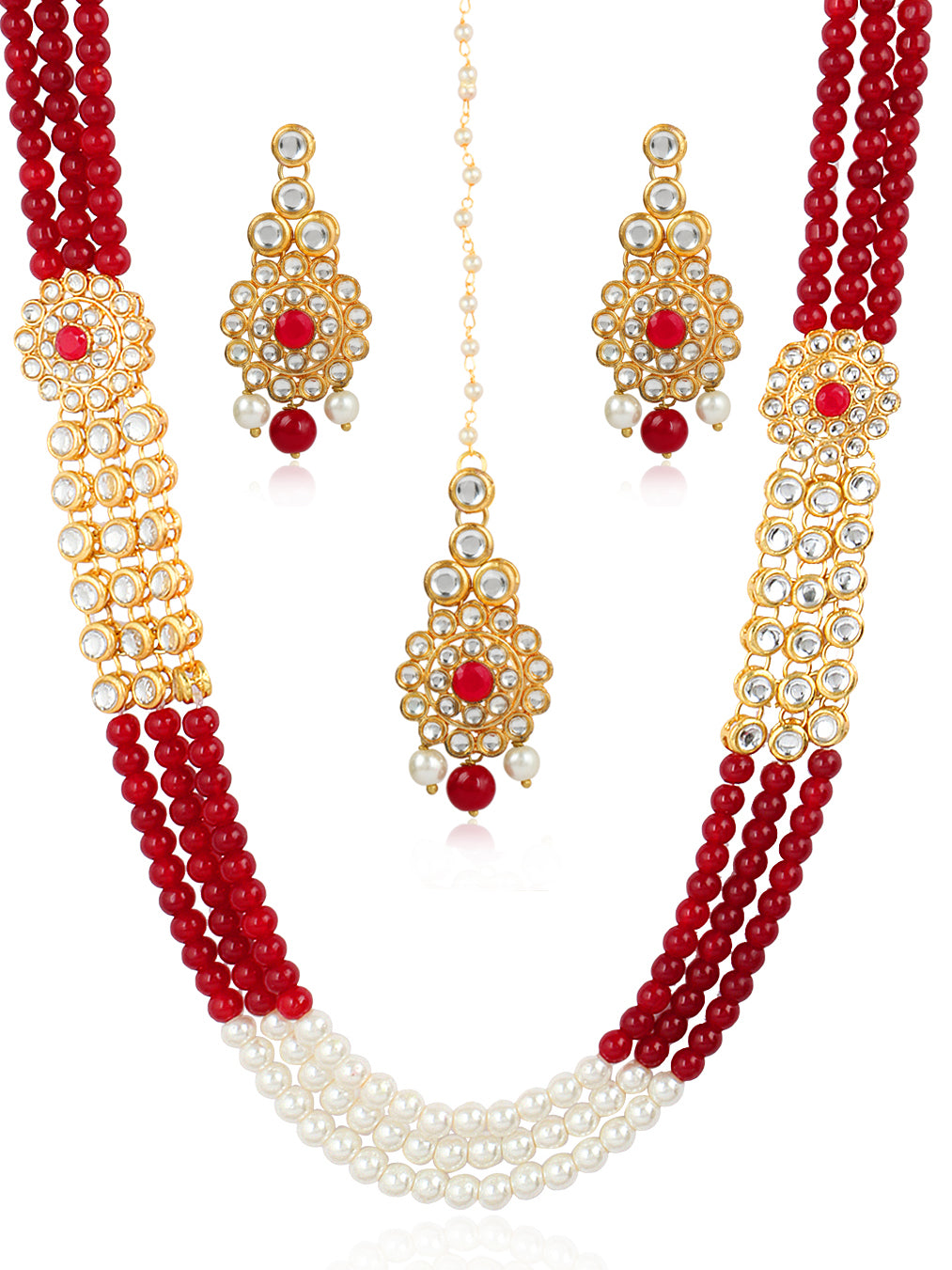 Gold-Plated Red Beads and Pearl Ball Studded Handcrafted Kundan Necklace Set