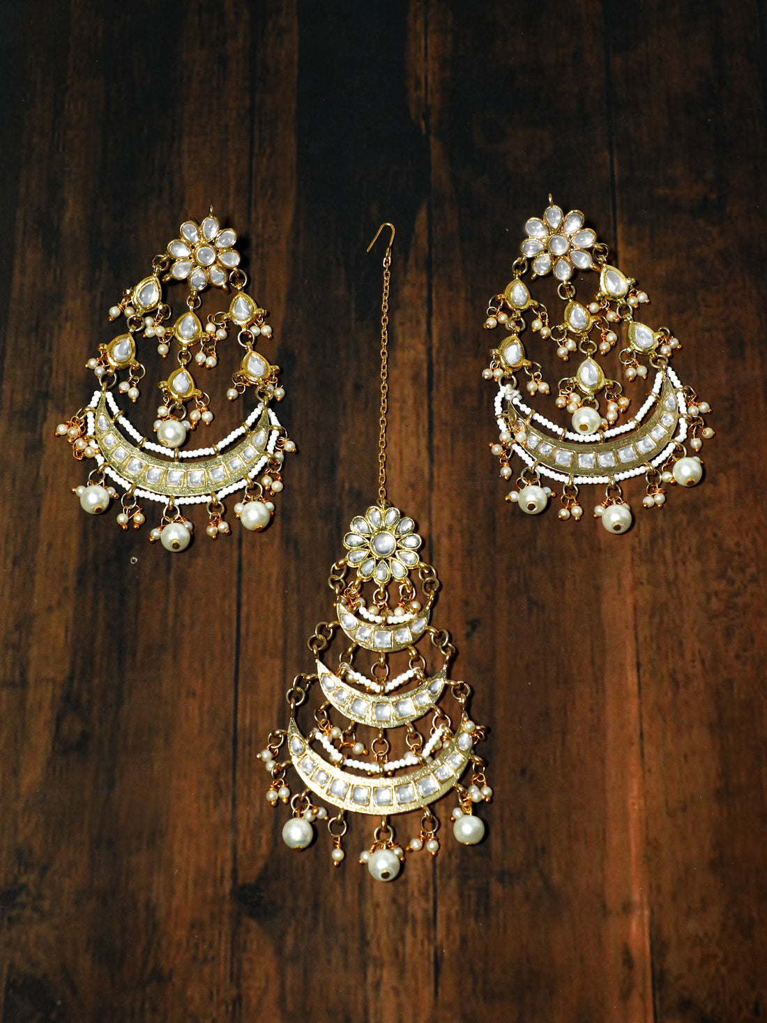 Gold Plated Pearl Beads Kundan Chandbali Earrings with Maangtikka