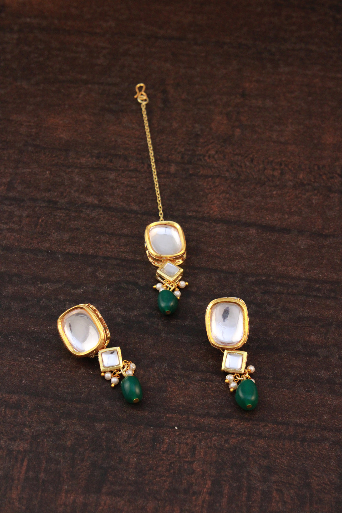 Traditional Gold Plated Green Beads Polki Kundan Dangler Earrings with Maangtikka