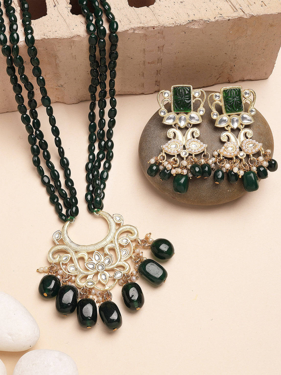Karatcart Green Tumble Stone Kundan Rani Haar Necklace Set for Women