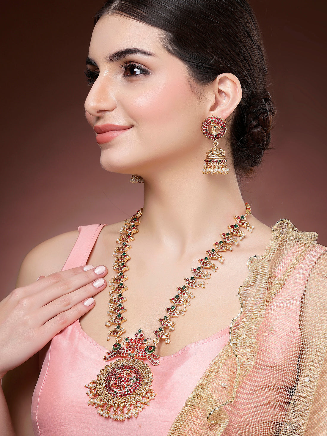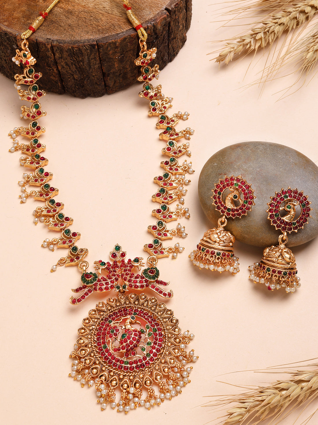Karatcart Traditional South Indian Style Peacock Temple Necklace Set Red and Green Detailing
