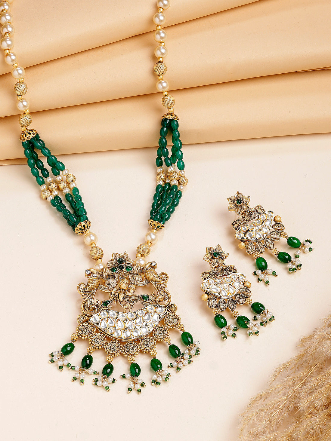 Karatcart Antique Gold Plated Green Tumble AD Temple Jewellery Set for Women