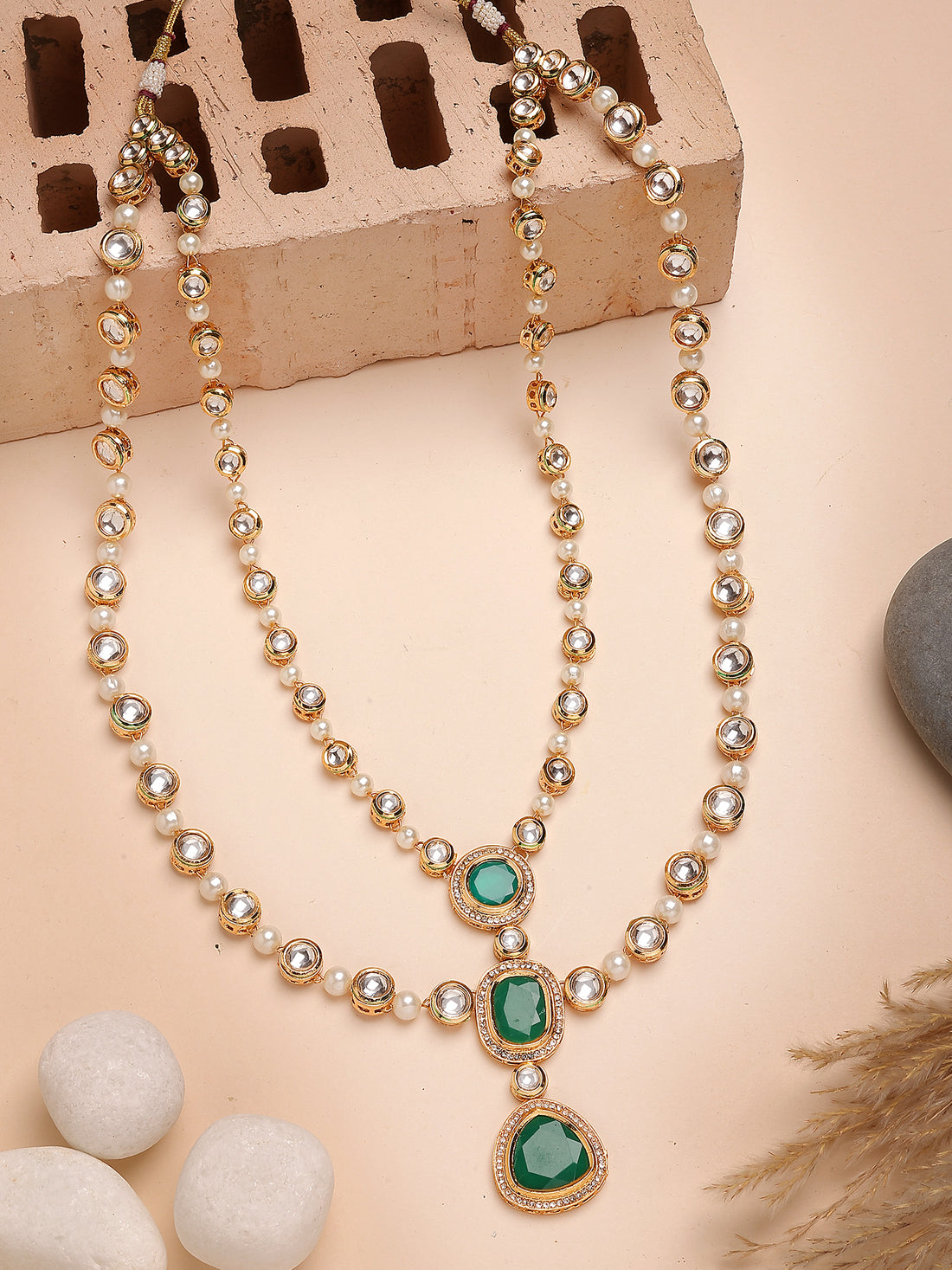 Karatcart Green Beads Polki Kundan Long Rani Haar Necklace Set for Women