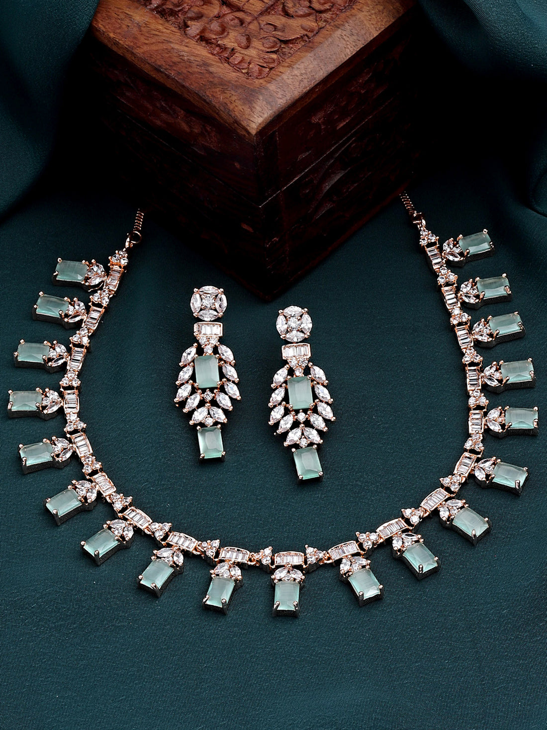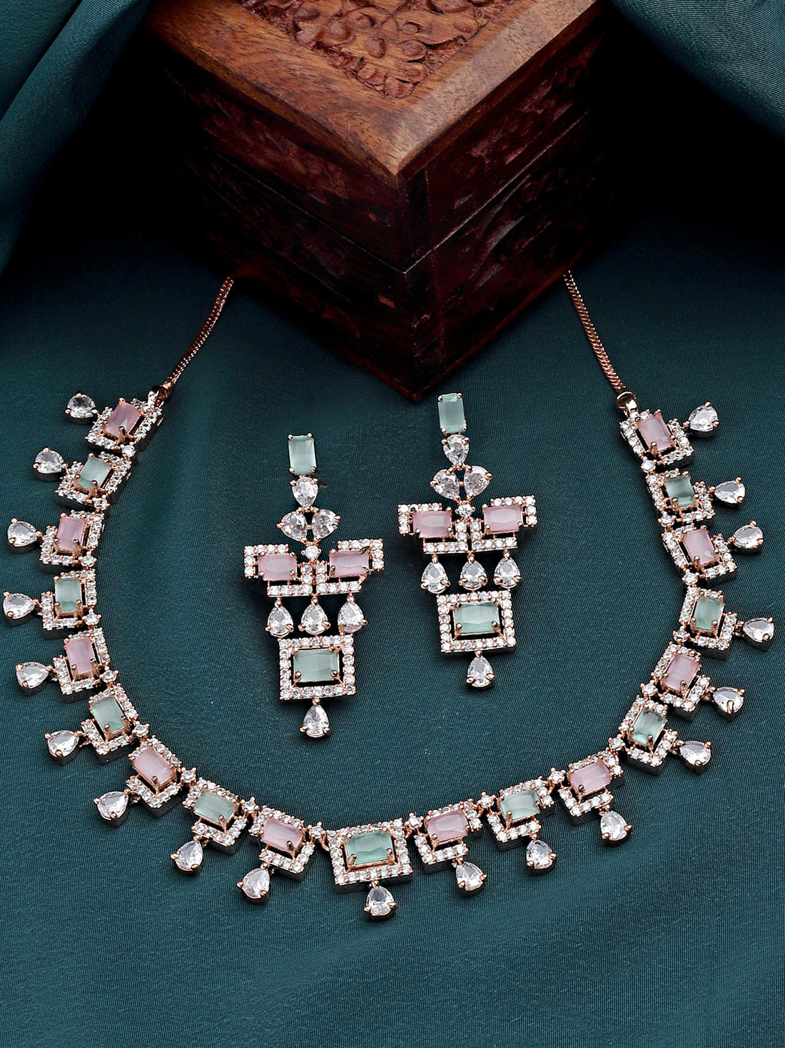 Rose Gold Plated White and Lime Green Cubic Zirconia Studded Necklace Set For Women. It...