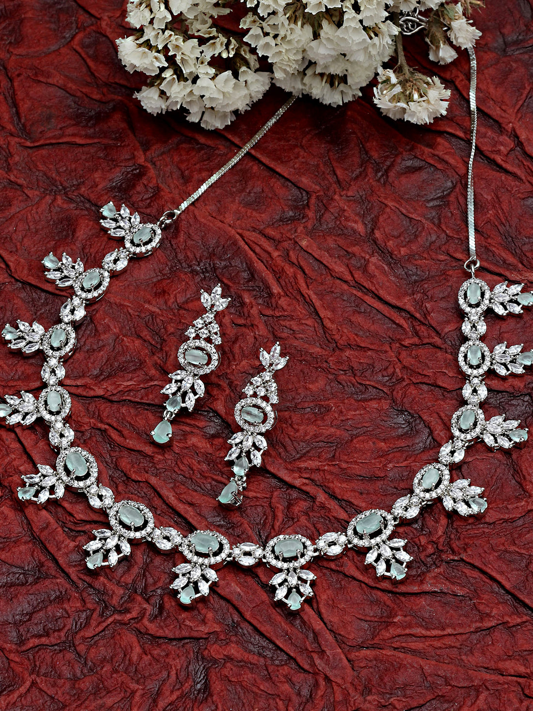 Silver Tone Light Green American Diamond Studded Necklace Set For Women. It is made with...