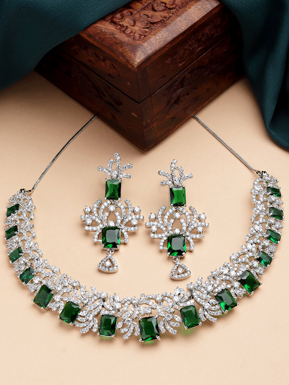 Silver Tone Green AD Necklace Set for Women. It is made with High-Quality AAA Cubic...