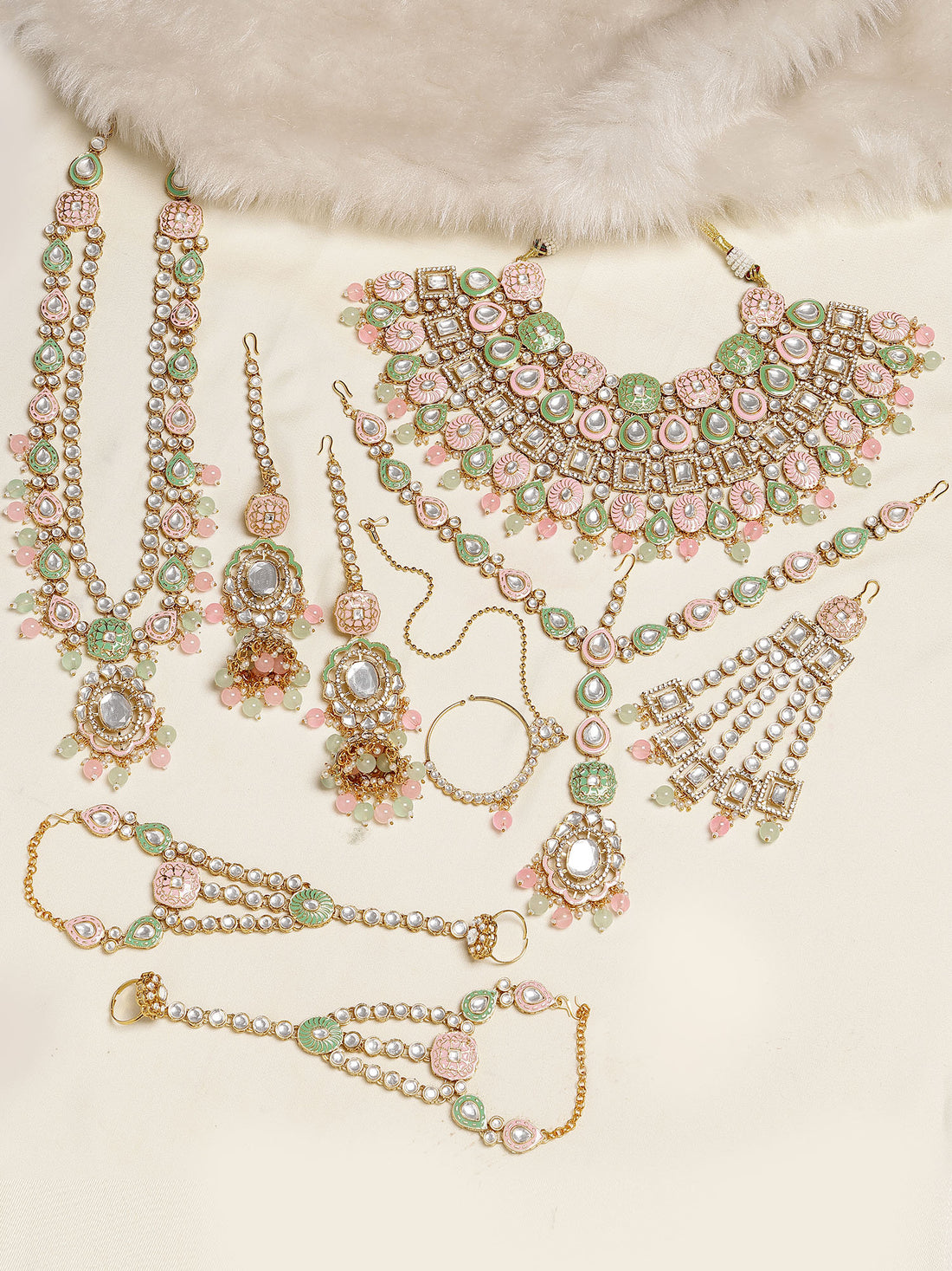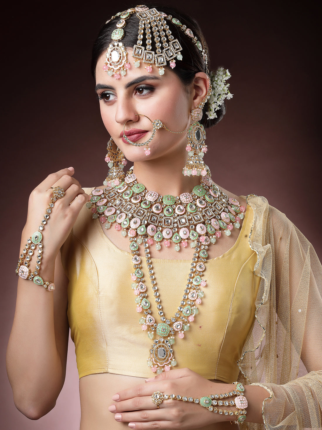 Karatcart Gold Plated Lime Green and Pink Enamel Traditional Kundan Dulhan Bridal Jewellery Set