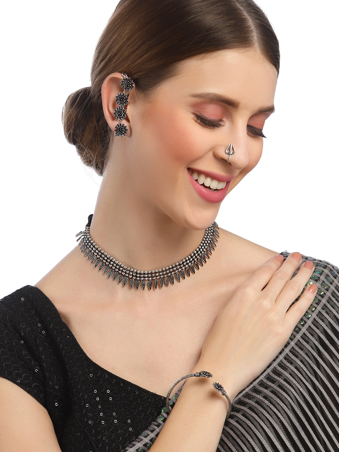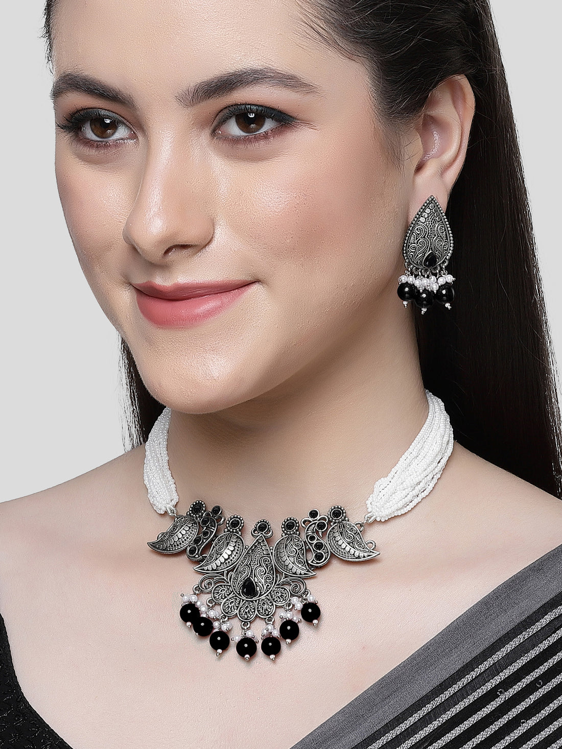 Karatcart Black Beads Oxidised Silver Jaipuri Choker Necklace Set for Women