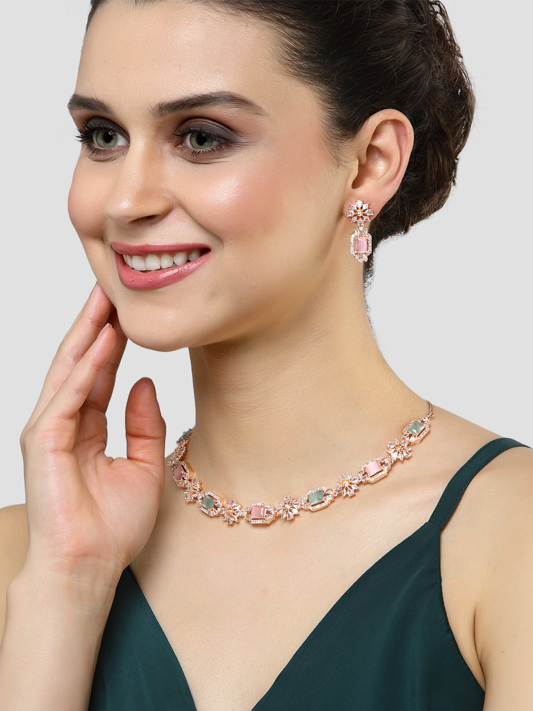 Karatcart Rose Gold Plated Pink and Light Green Cubic Zirconia Studded Necklace Set
