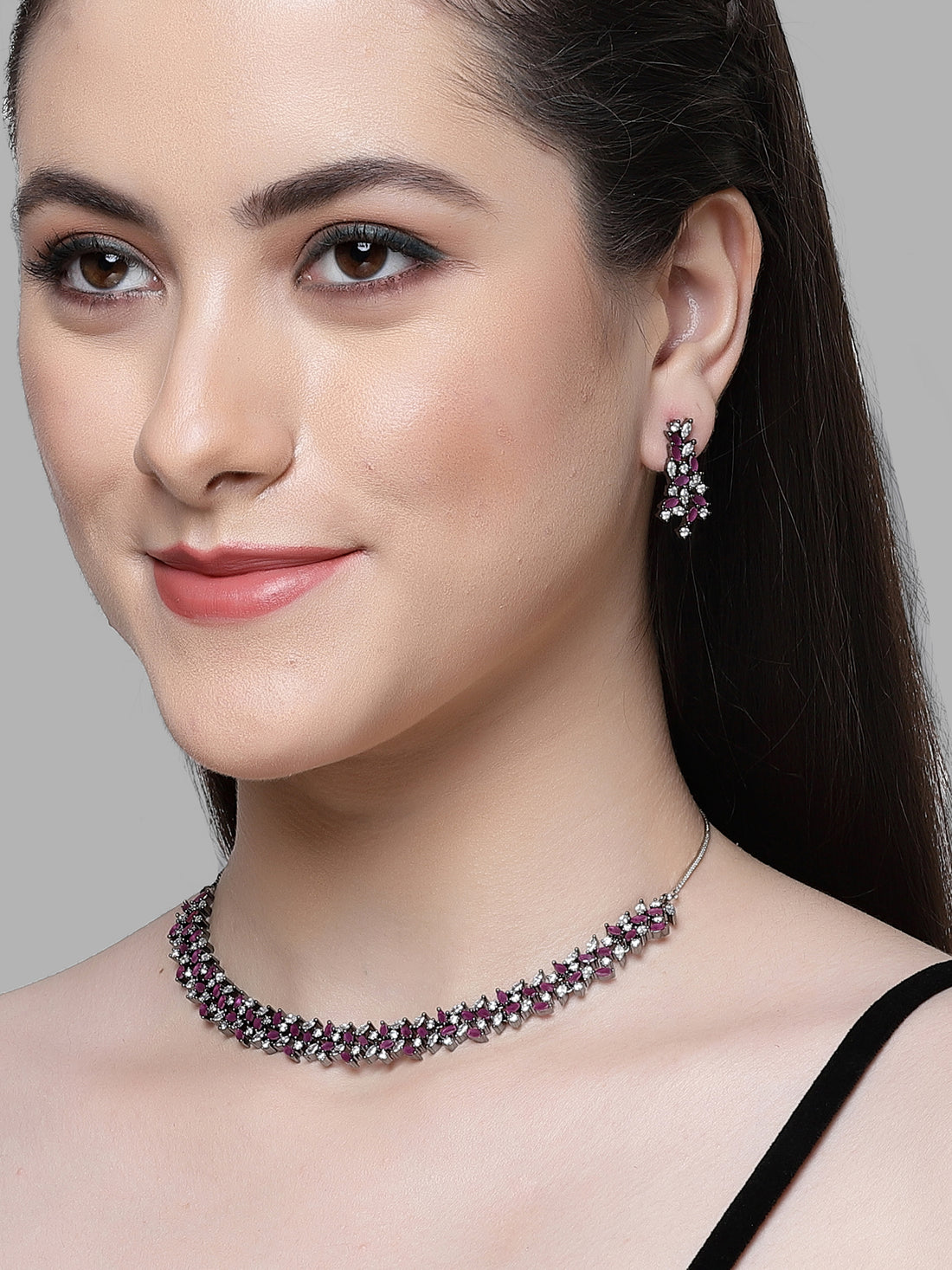 Karatcart Black Silver Plated Purple and White Cubic Zirconia Studded Necklace Set