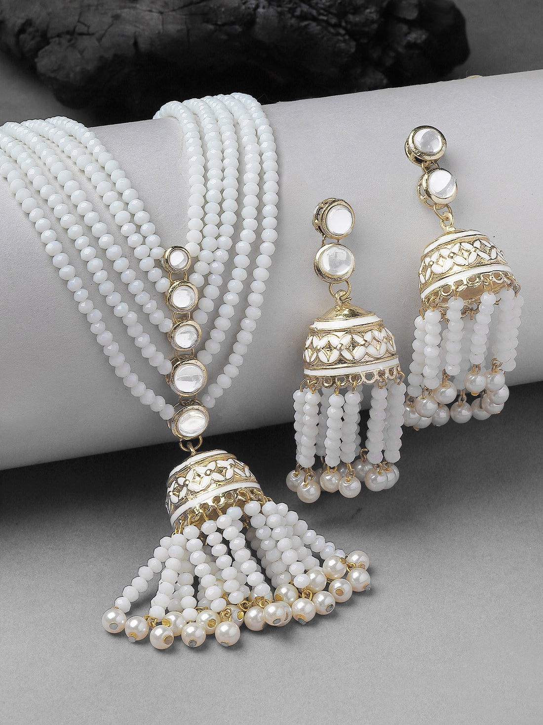Karatcart White Opaque Crystal Gold Plated Kundan Rani Haar Necklace Set for Women