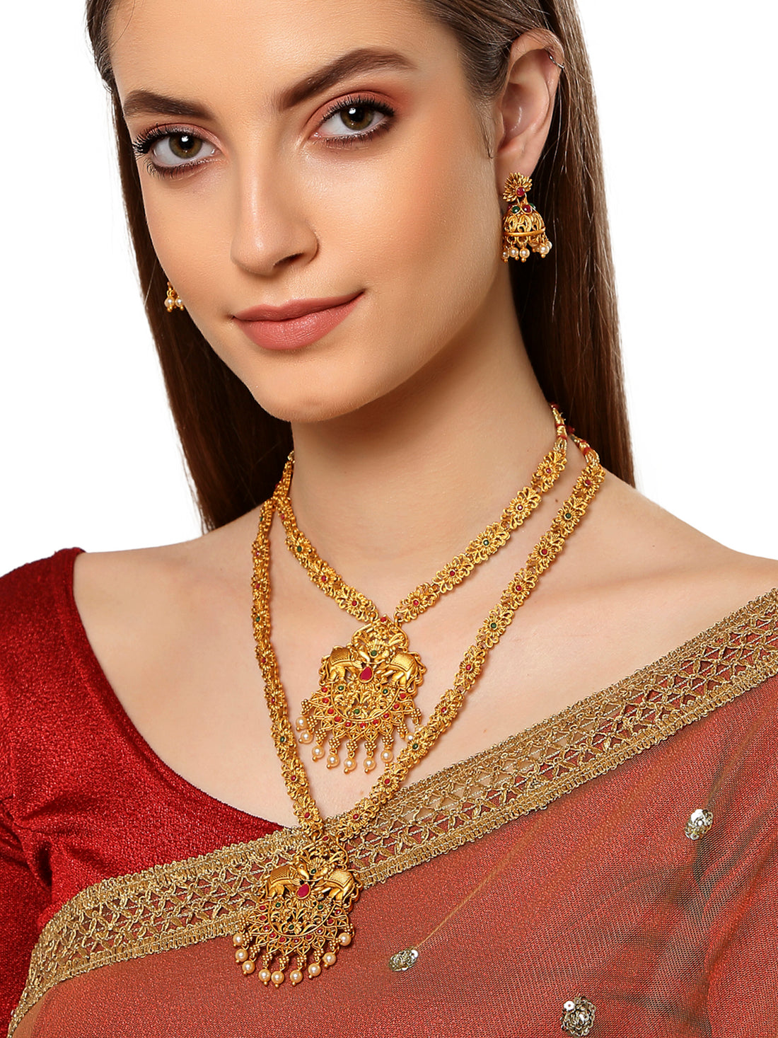 Combo of 2 Red Stone Studded Gold Plated Handcrafted Temple Necklace Set