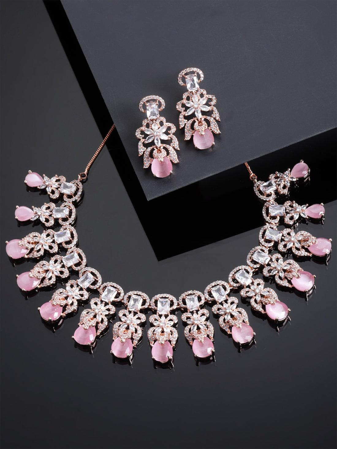 Karatcart Graceful Rose Gold Necklace Set with Cubic Zirconia Embellishments and Rhodium Finish