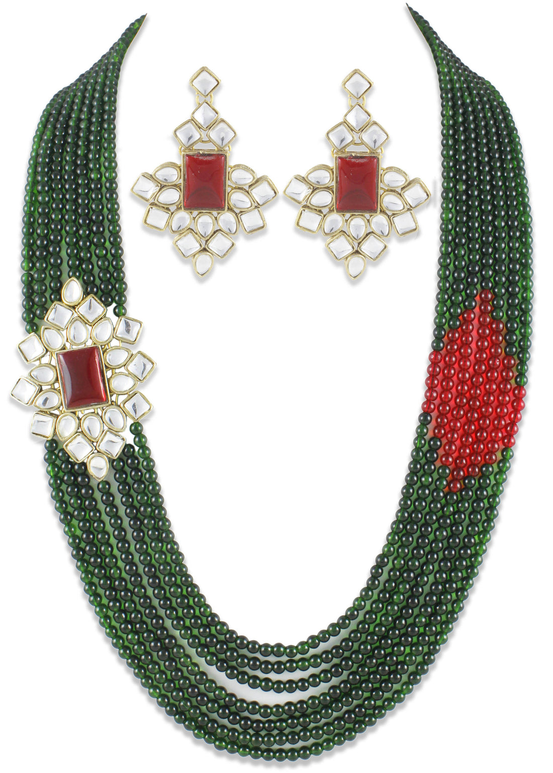Hexagonal Red Brooch With Green Beads Kundan Rani Haar Necklace Set