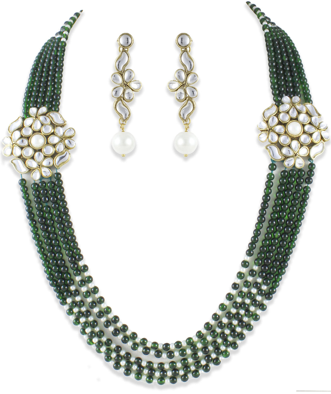 Karatcart Pearl Beaded Light Green Carved Stone Kundan Rani Haar Necklace Set for Women