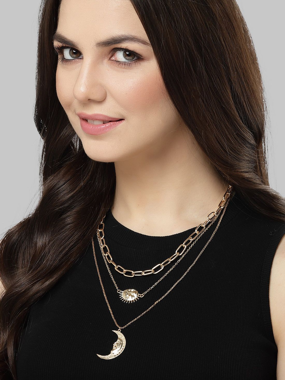 Bohey by KARATCART Gold Plated Half Sun and Moon Multicharm Multilayered Chain Necklace for Women