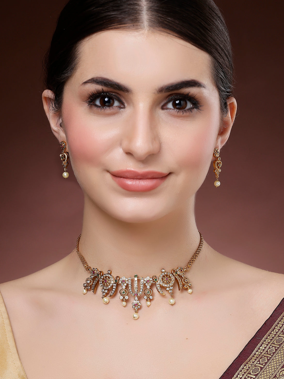 Karatcart Gold Plated Floral Design Choker Temple Jewellery Set for Women
