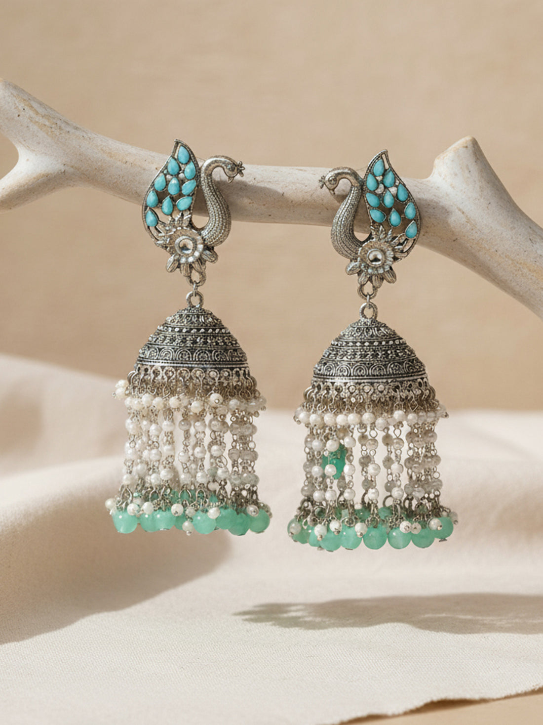 Karatcart Oxidised Silver Light Blue Kundan Peacock Jhumki Earrings for Women