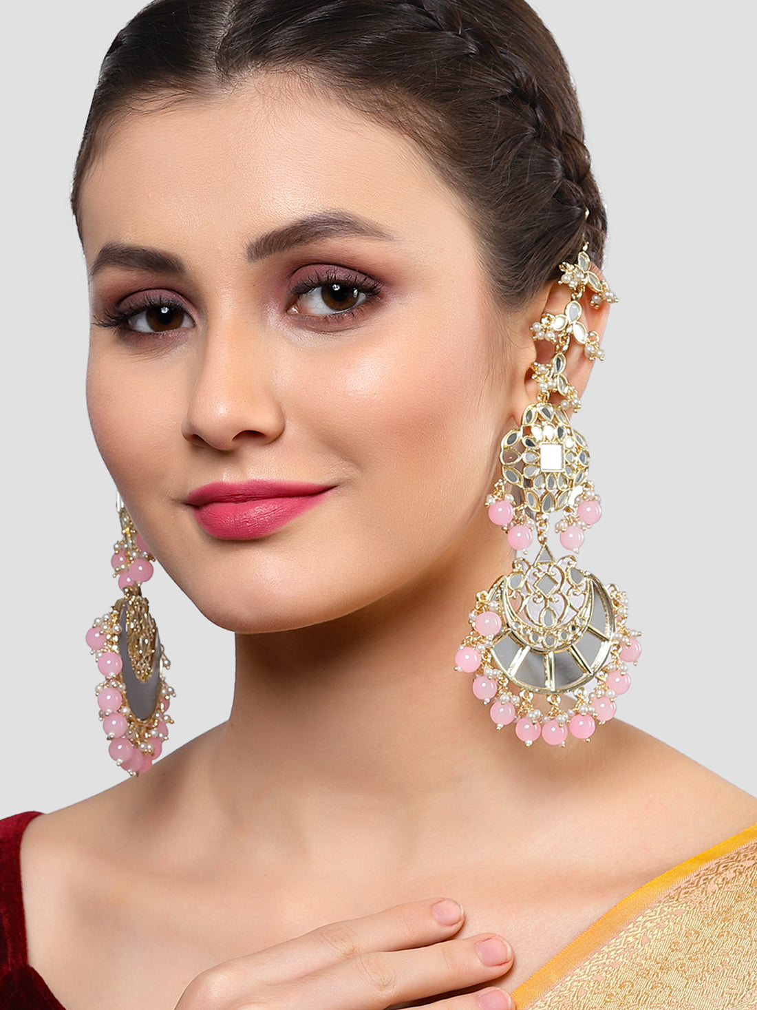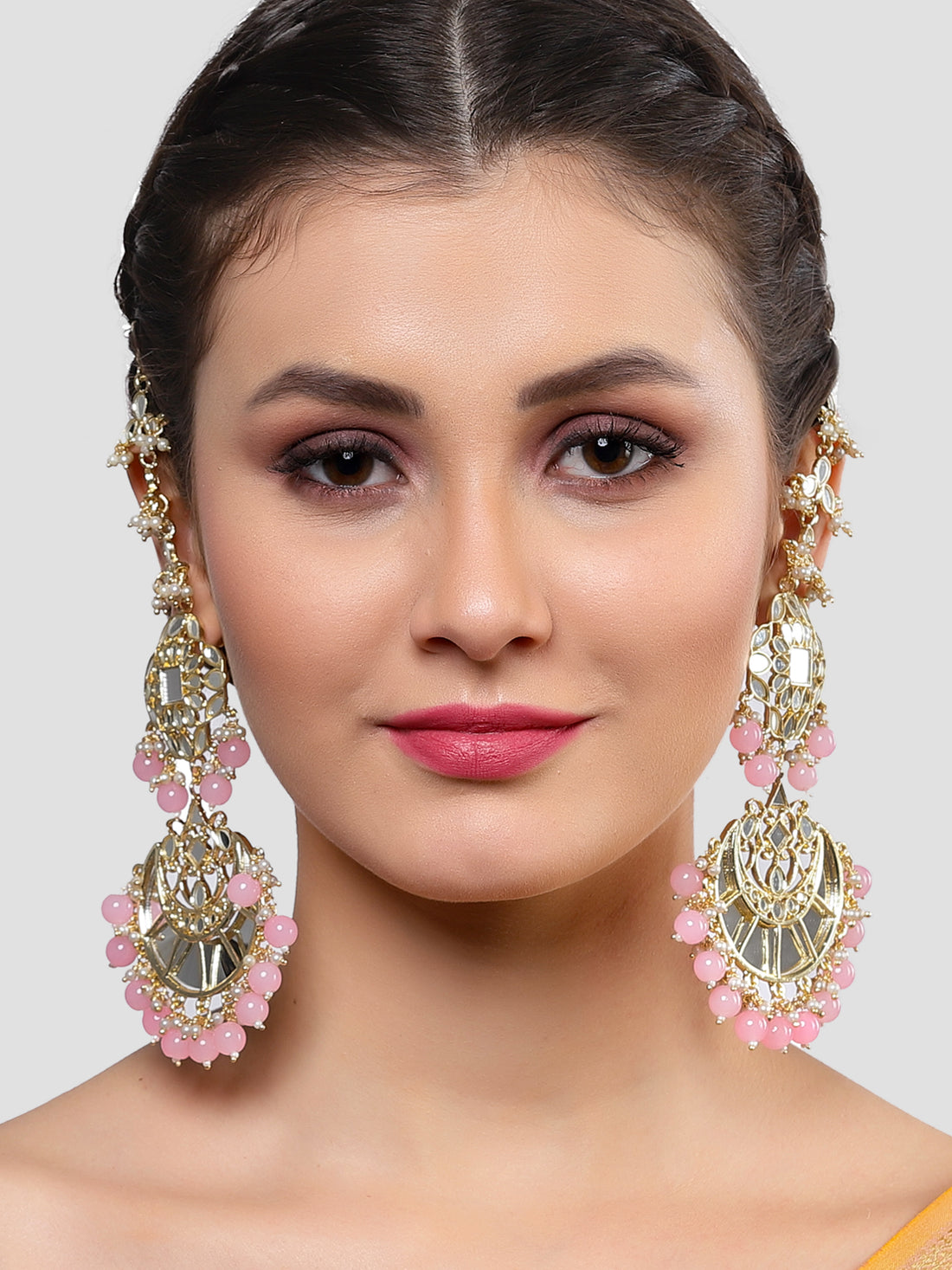 Karatcart Gold Plated Pink Beads Mirror Studded Kaanchain Earrings for Women
