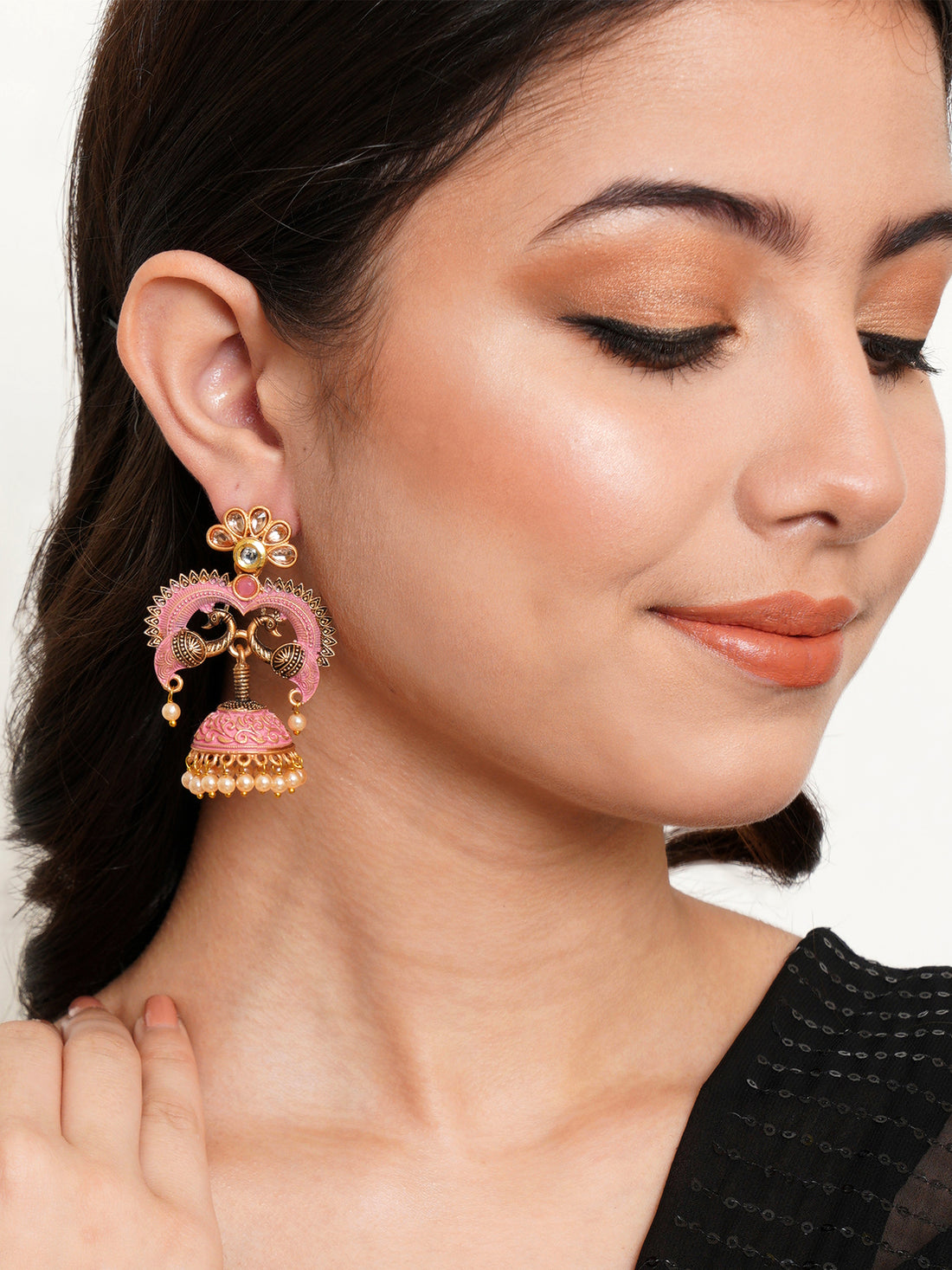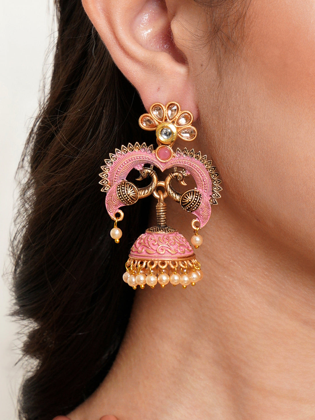 Karatcart Antique Gold Plated Kundan Studded Pink Meena Peacock with Flat Jhumki Dangler Earrings