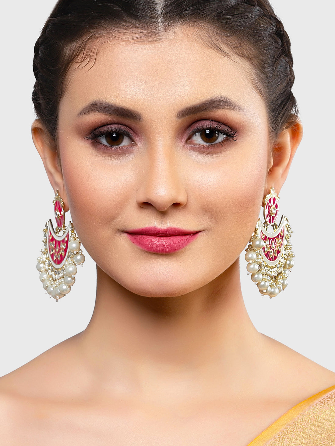 Karatcart Gold Plated Pink Meena Pearl and Kundan Studded Chandbali Earrings for Women