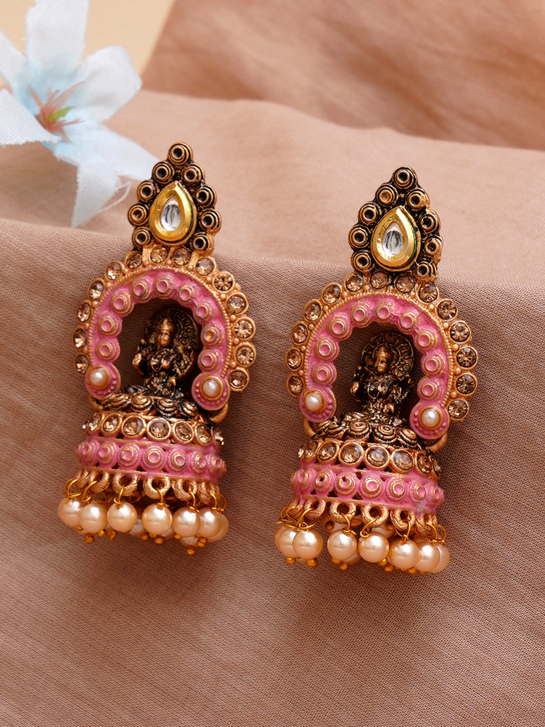 Karatcart Antique Gold Plated Pink Mata Laxmi Jhumki Earrings for Women